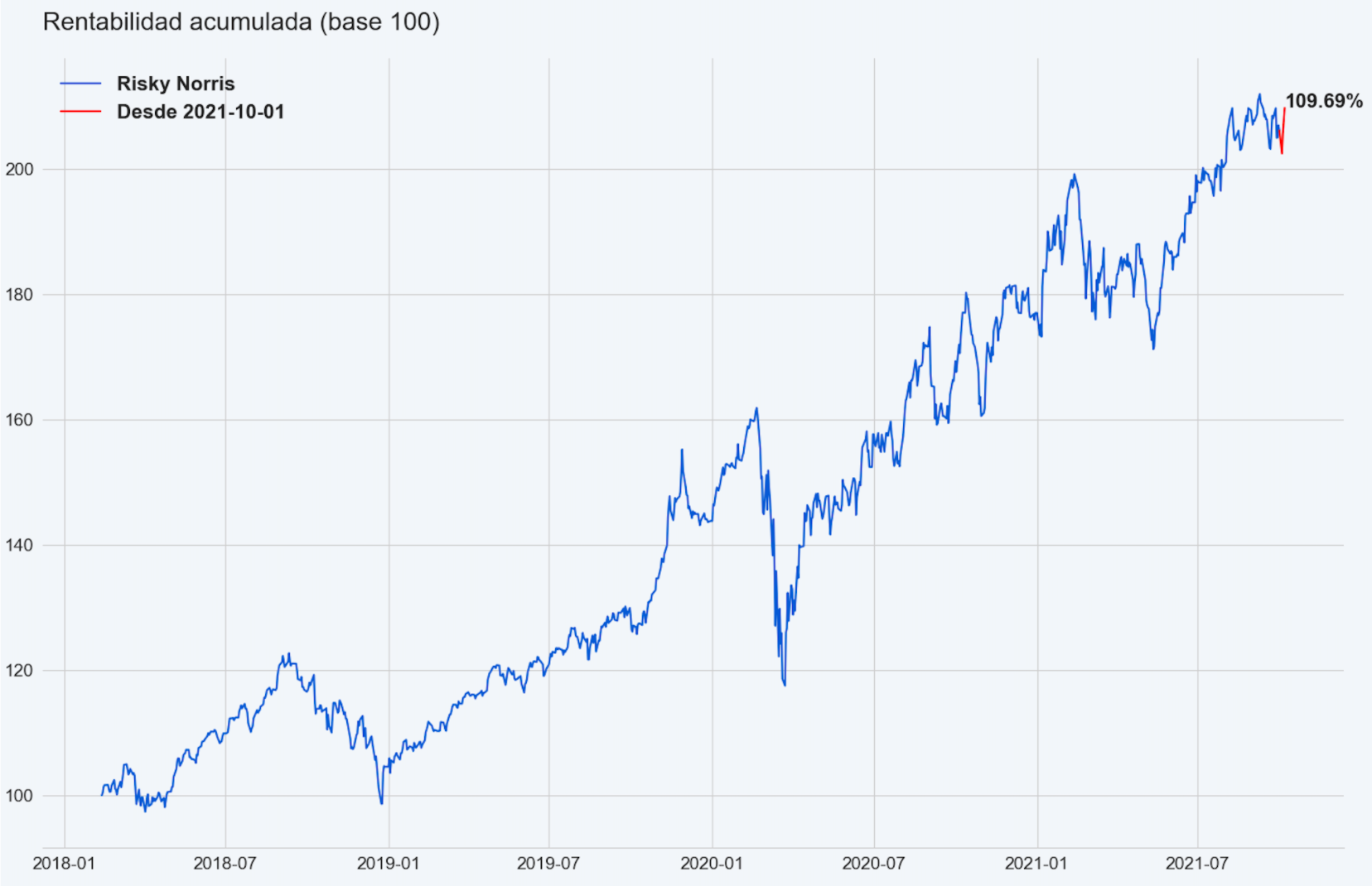 Las rentabilidades nominales corresponden a la serie A de cada fondo, que al cierre de 10/2021 son: Conservative Clooney -0,22% para el mes, 2,08% últimos tres meses, 2,28% último año; Moderate Pitt 0,16% para el mes, 3,58% últimos tres meses, 11,88% último año; Risky Norris -0,58% para el mes, 4,28% últimos tres meses, 21,69% último año.