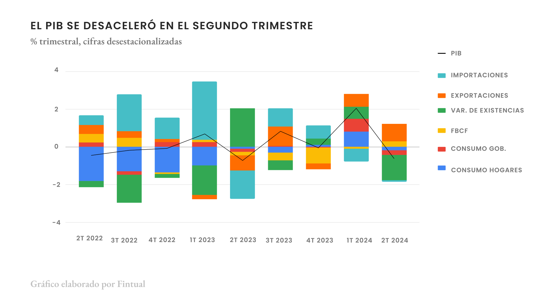 Al interior del consumo, el de los hogares se contrajo -0,3% en el trimestre, mientras que el consumo de gobierno cayó -1,6% en el mismo periodo, después de expandirse más de 4% en el primer trimestre. Por su parte, la formación de capital se expandió 1,4% en el trimestre, principalmente por mayor inversión en maquinaria y equipo. Todo esto con cifras ajustadas por estacionalidad.