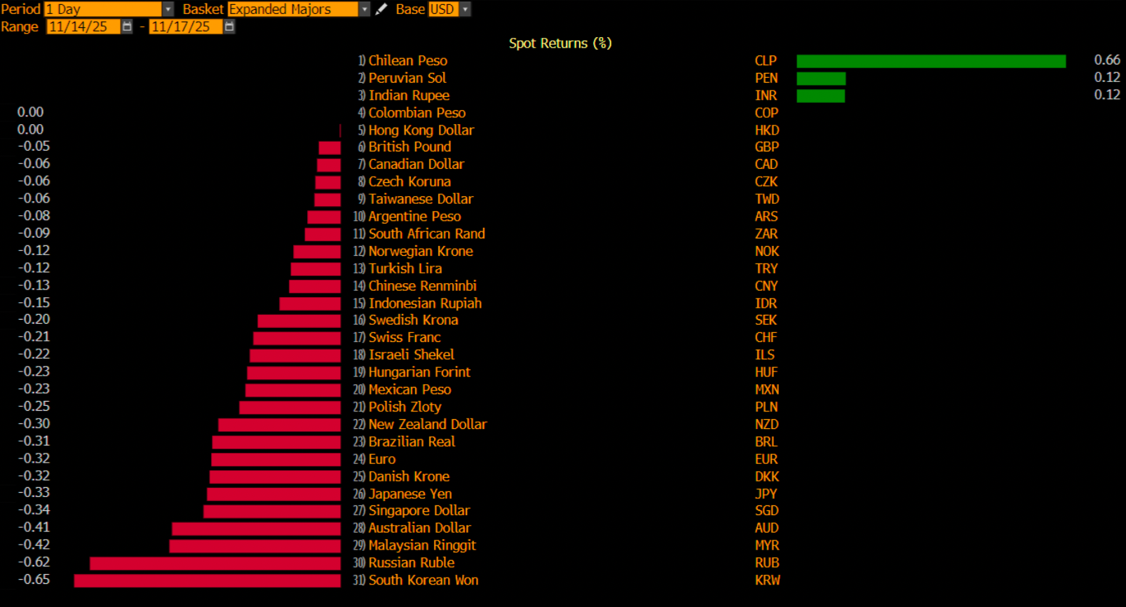 Finalmente, el viernes el presidente de la Fed de Nueva York, John Williams, señaló en la conferencia anual del Banco Central de Chile que ve espacio para otro recorte de tasas "en el corto plazo" debido a señales de debilitamiento en las condiciones laborales. Con esto las probabilidades de un recorte en diciembre subieron de 35% a cerca de 73%.