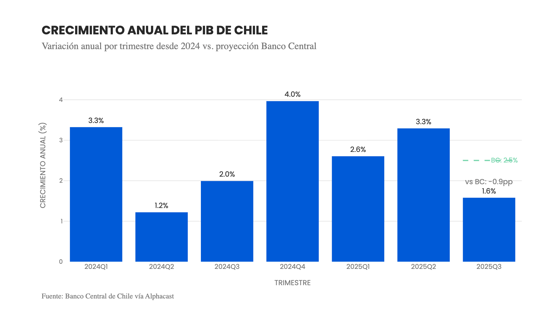 El martes se publicó el crecimiento del tercer trimestre, y los datos decepcionaron al consenso de los analistas. En lugar de expandirse 0,1%, la economía se contrajo 0,1%. Con esto, el crecimiento anual fue de 1,6%, una significativa desaceleración desde el 3,3% que se registró el trimestre pasado. Si bien buena parte de este freno a la economía se explica por la minería, que se vio afectada por el accidente en la mina El Teniente en agosto, el desempeño es mucho más débil que el 2,5% que proyectó el Banco Central en su último IPOM, lo cual respalda la continuidad del ciclo de recortes de tasas.