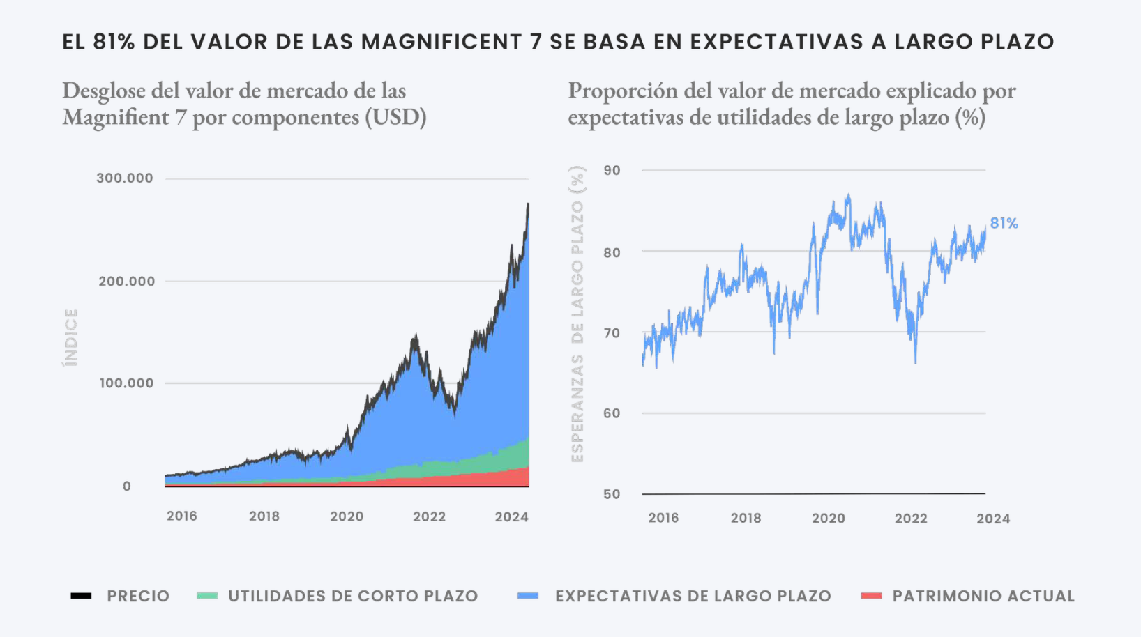 A pesar de esto, vale la pena cuestionar cuánto del aumento en precios se debe a buenos resultados financieros y cuánto a exceso de optimismo. Una forma de medir expectativas excesivas es calcular qué proporción del precio actual refleja únicamente expectativas de largo plazo, un horizonte en que la visibilidad del mercado es limitada. Esto permite aislar la porción especulativa del precio. Según nuestras estimaciones, el 81% del valor de las grandes tecnológicas corresponde a expectativas de largo plazo, por encima de su promedio histórico, pero aún por debajo de sus máximos.