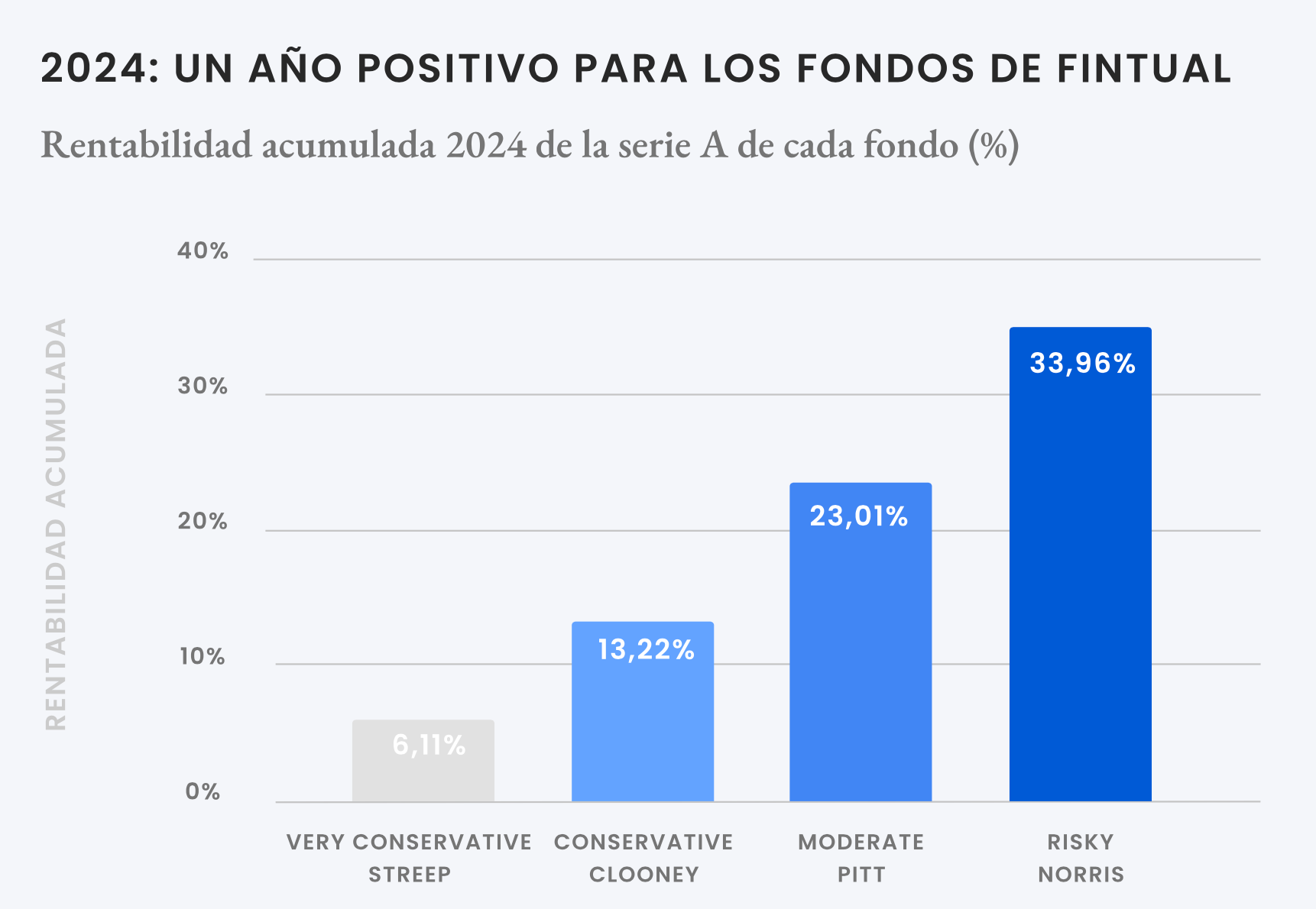 Tras un muy buen 2023, el 2024 fue un buen año para las inversiones en Fintual. Todas las estrategias terminaron con rentabilidades positivas y con resultados mejores que índices de referencia de cada fondo, como por ejemplo el índice de acciones globales MSCI ACWI como benchmark referencial de la parte accionaria de nuestras estrategias riesgosas.
