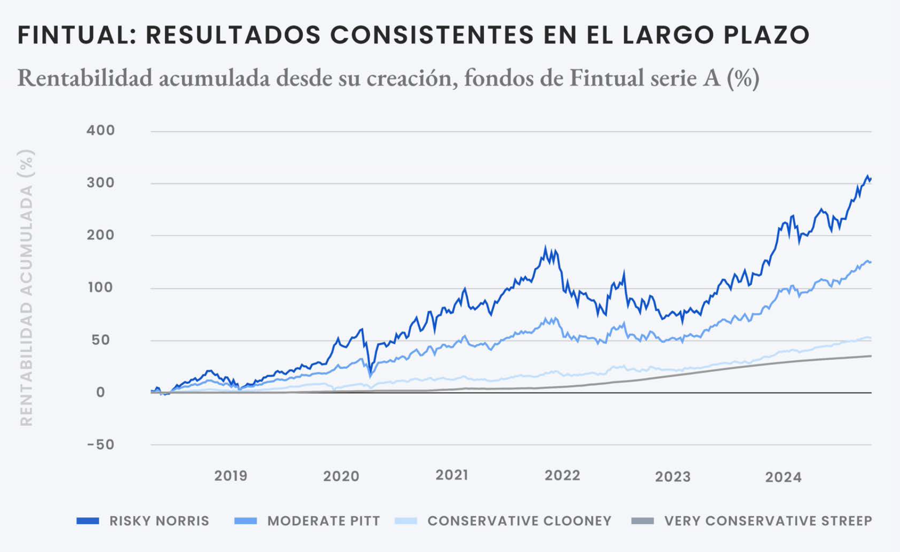 Este buen desempeño de los fondos se suma al notable historial de resultados que nuestras estrategias han logrado desde el inicio de operaciones de Fintual. Esto es especialmente significativo si consideramos que los fondos han tenido que superar distintos episodios desafiantes, como la crisis del COVID en 2020, la invasión de Rusia a Ucrania en 2022, la caída de los mercados globales el 2022, y la fuerte alza que han experimentado las tasas de interés en los últimos tres años.