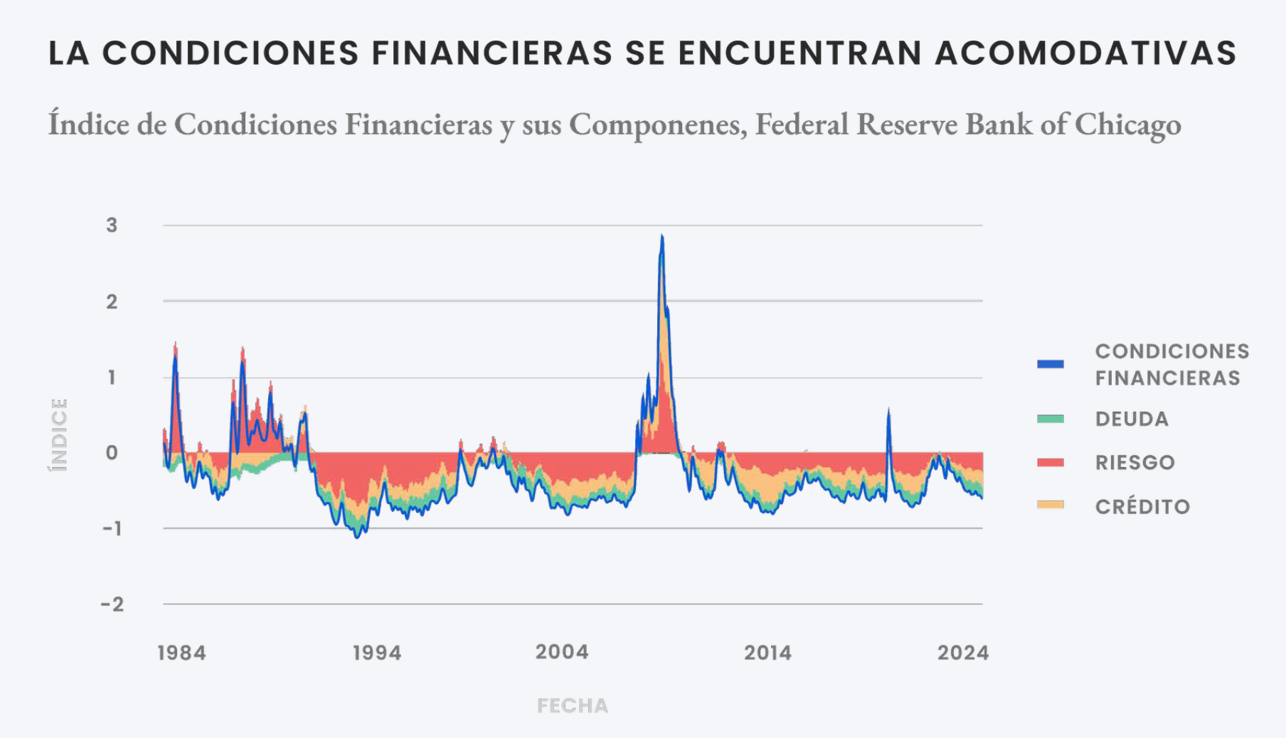 Desde el lado macroeconómico, aunque tomó más tiempo de lo esperado, la Fed ya inició su ciclo de recortes de tasas. A pesar de estar aún lejos de su tasa de interés neutral, las condiciones financieras en EE.UU. hoy están bastante acomodativas (esto es, que están dadas las condiciones para conseguir crédito, levantar capital o acceder a financiamiento). Si bien esto favorece a las empresas y sus acciones, este poco espacio limita la capacidad de la Fed para responder ante posibles debilitamientos de la economía.