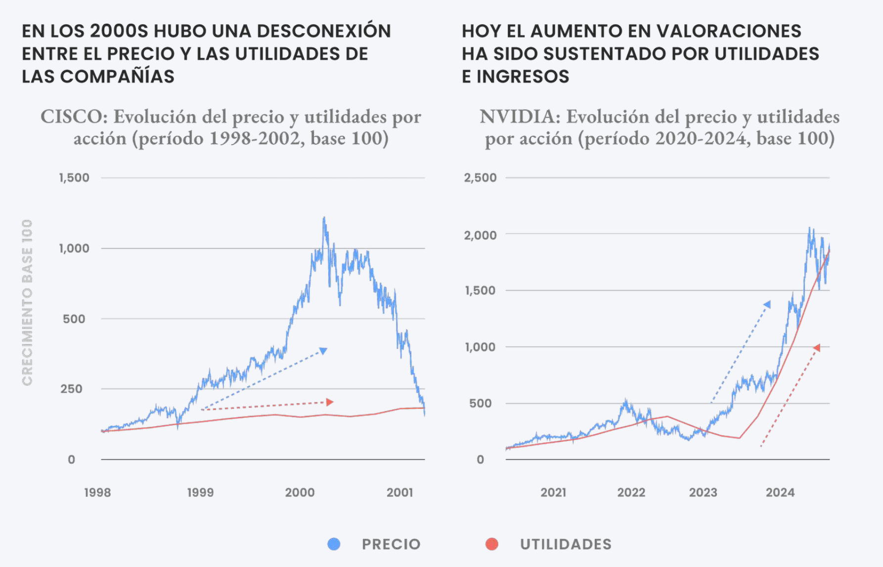 En cuanto a las compañías, como hemos discutido en otras publicaciones, el 2024 las acciones globales —especialmente las del S&P 500 y las grandes tecnológicas— han subido notablemente en precio, y con ello, sus valorizaciones y múltiplos financieros se ven relativamente altos. Sin embargo, parte de este encarecimiento, a diferencia de burbujas anteriores, ha venido respaldado por aumentos en las utilidades de las compañías.