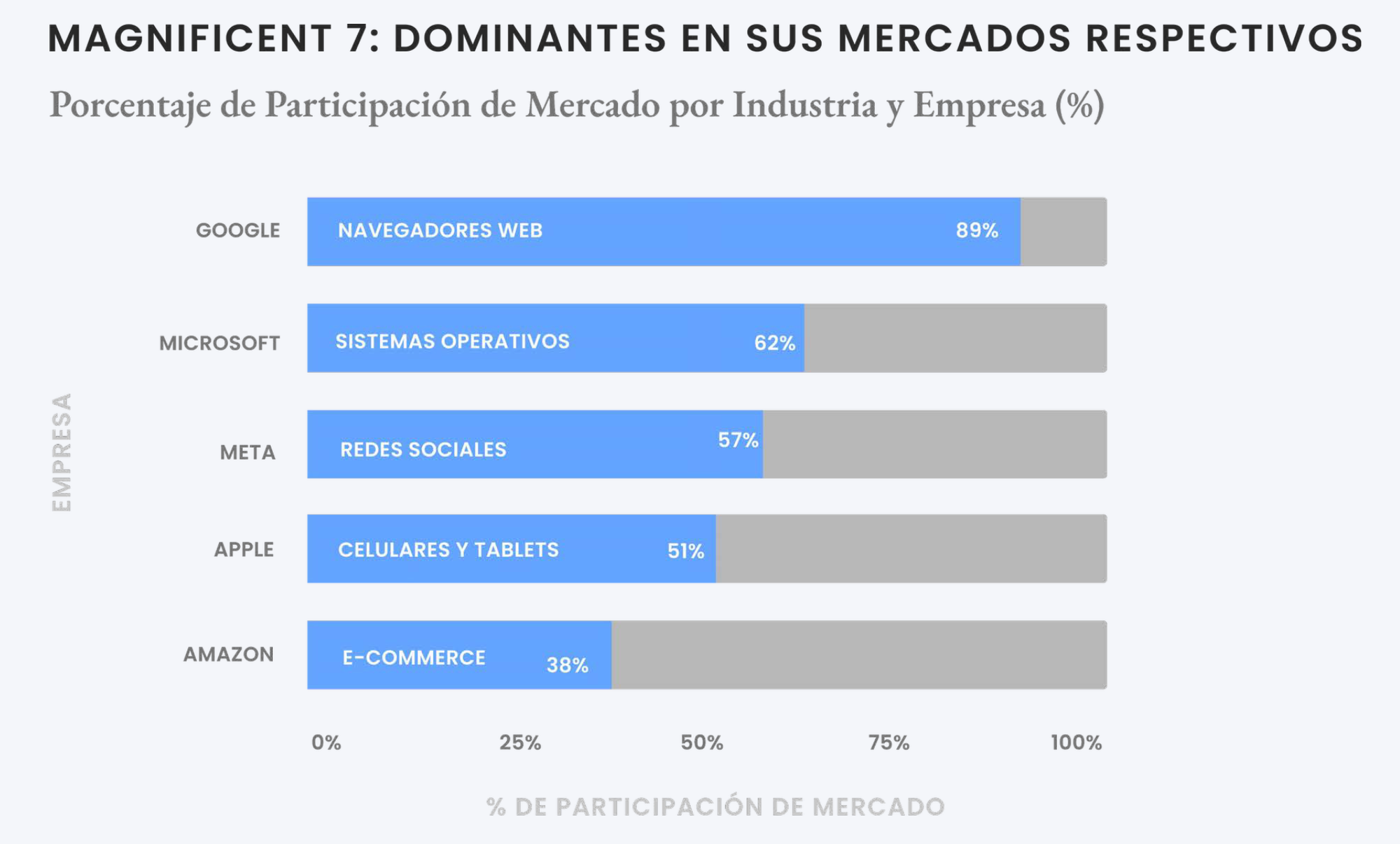 Con este último análisis, no estamos sugiriendo que nos encontremos en una burbuja. Por el contrario, hoy las grandes compañías tecnológicas se mantienen con balances financieros sanos, márgenes elevados y modelos de negocio diversificados en múltiples fuentes de ingreso. Esta versatilidad les brinda la capacidad de seguir siendo las compañías mejor posicionadas para capturar el potencial de crecimiento que proveen las nuevas tendencias para los próximos años. La Inteligencia Artificial es sólo un ejemplo de cómo la alta incumbencia de las magnificent 7 les ha permitido ser los first movers en cada nueva disrupción tecnológica que entra al mercado. La incumbencia y ventajas competitivas de estas empresas les permiten tener dominancia para beneficiarse directa o indirectamente en prácticamente todos los segmentos donde compiten.