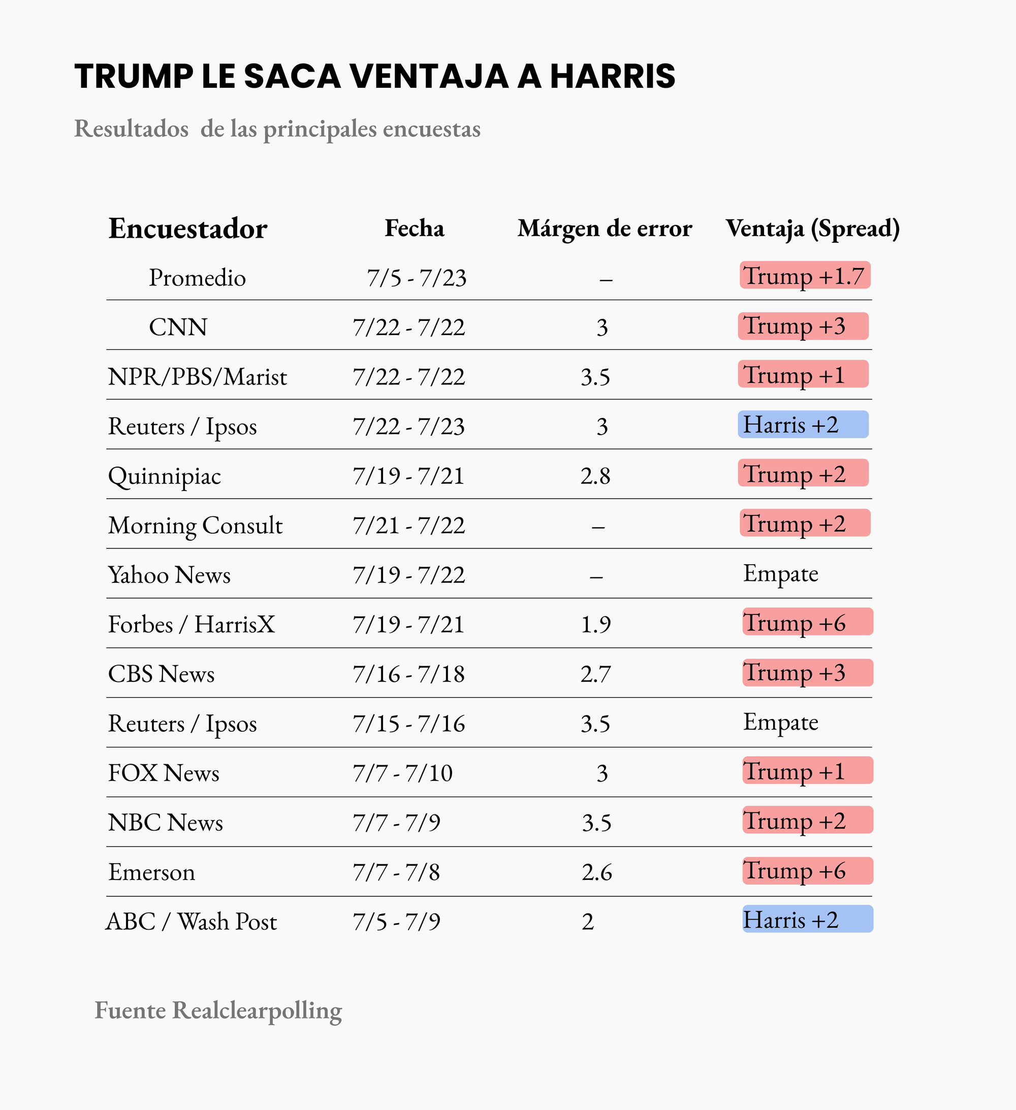 Para los demócratas es buen indicio que la campaña de Harris batió récord de donaciones desde que Biden dio un paso al lado en la candidatura. Recaudó una histórica suma de 81 millones de dólares en las primeras 24 horas. Si bien esto sugiere que Harris es una contendiente más fuerte que Biden, estamos lejos de poder asegurar que sea suficientemente fuerte para ganarle a Trump.