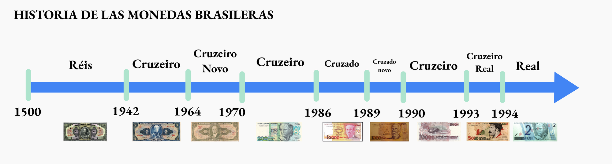 Desde entonces, otras 7 monedas pasaron por Brasil antes de la llegada del Real. Las monedas suelen ser cambiadas para contener la inflación y hacer más sencilla la vida de las personas: así pueden andar con menos efectivo para hacer sus compras (qué horror tener que cargar y contar miles de billetes para comprar un pan).