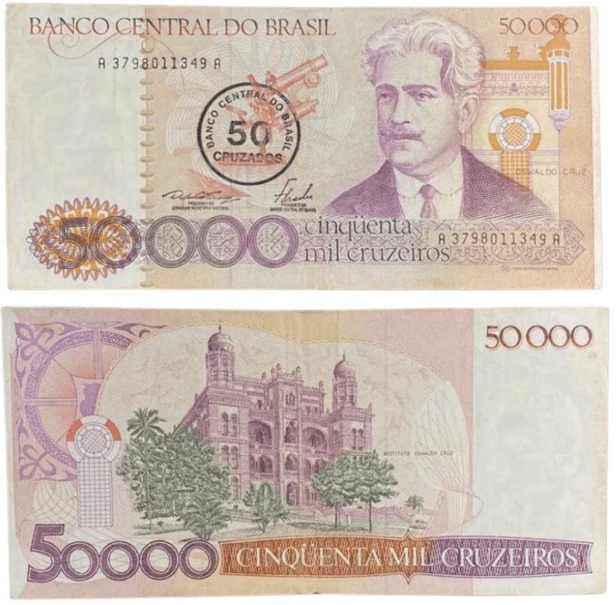 En 1986, otras tres monedas habían pasado después del Reis, y la inflación subía rápido, llegando a 16,2% al mes. Para contenerla, la moneda de ese entonces, el Cruzeiro, fue sustituida por el Cruzado, cortando tres ceros de la moneda antigua. Y fueron muy ahorrativos: ni siquiera hicieron billetes nuevos, se usaron los mismos, añadiendo un sello especial sobre ellas para marcar "la moneda nueva".