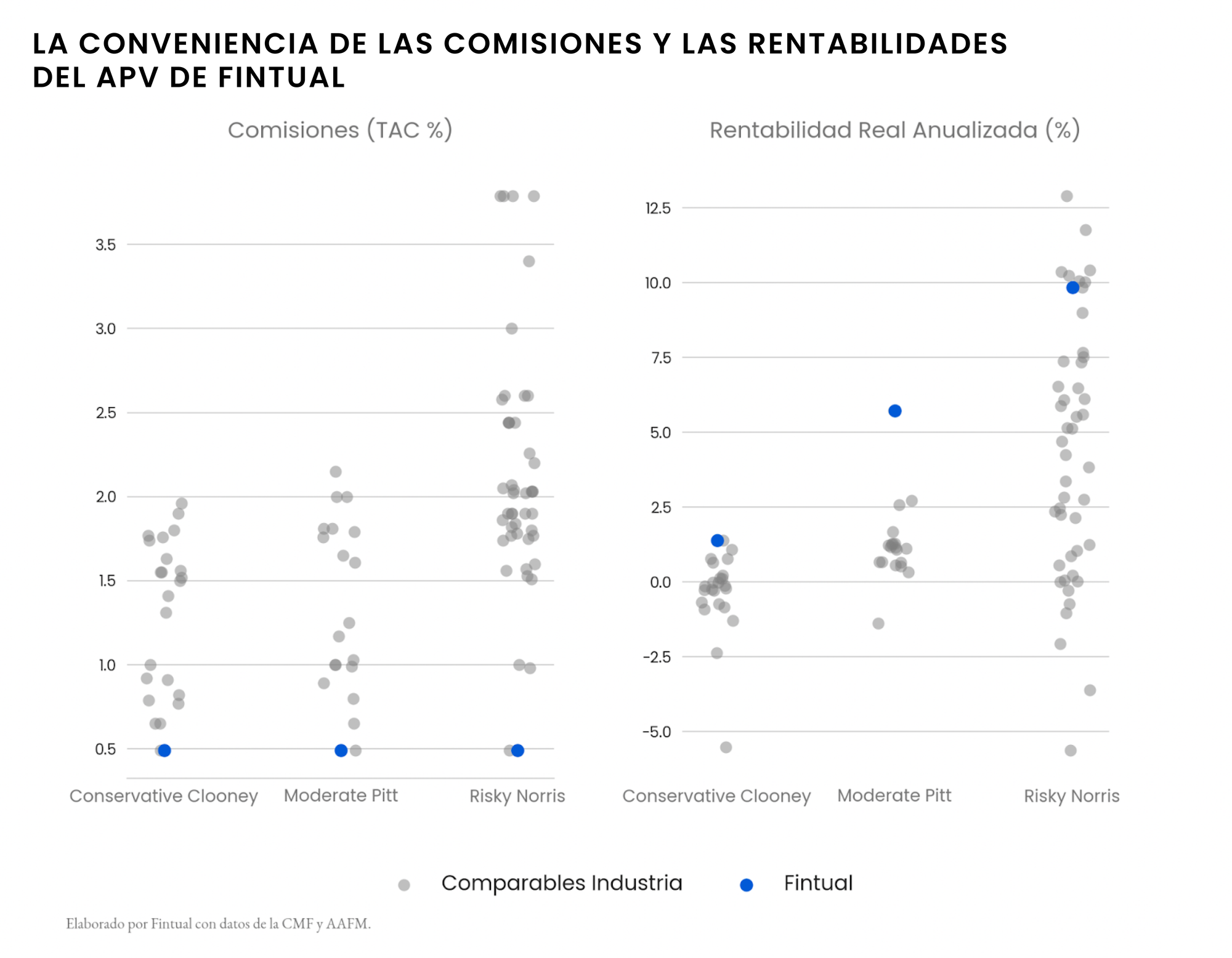 Los puntos azules son los 3 fondos de Fintual con APV, y los puntos grises son los fondos APV de la competencia. Para comparar las comisiones usamos el TAC (Tasa Anual de Costos) que incluye todos los costos del fondo, es decir, se excluyen las comisiones directas (esos cobros que cobran al retirar). La TAC se representa como un porcentaje del patrimonio del fondo, y generalmente está compuesta mayoritariamente por la remuneración fija.