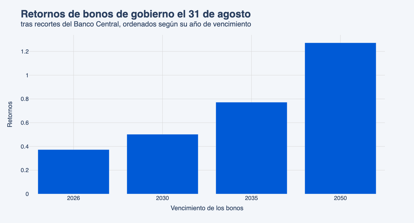 Así, cuando el BCCh recorta la TPM, los bonos estarán transando en el mercado a un precio mayor al que se transaban antes de recortar la tasa, y quienes compraron los activos cuando las tasas estaban más altas, pueden vender ahora su bono al nuevo precio en el mercado. Es decir, tienen en sus manos un papel que vale más que el precio al que lo compraron, por lo que obtuvieron ganancias de capital por el movimiento de tasas.