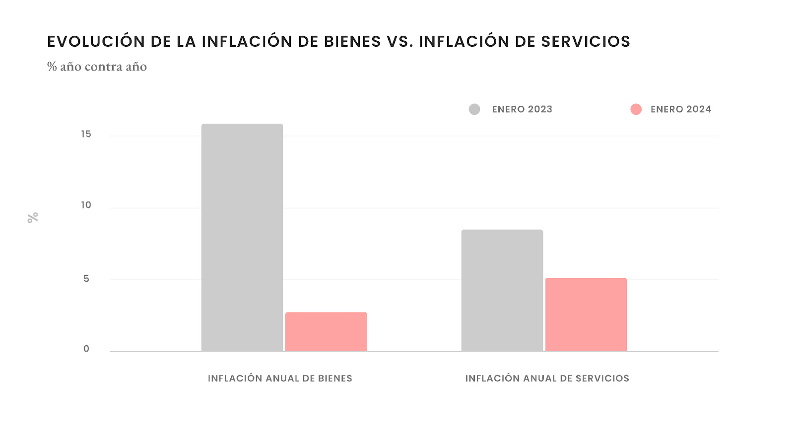 Esta diferencia se debe a que, como te contábamos, los bienes tienen una mayor ponderación que los servicios en la canasta nueva, y la inflación de los bienes ha bajado mucho más que la de los servicios.