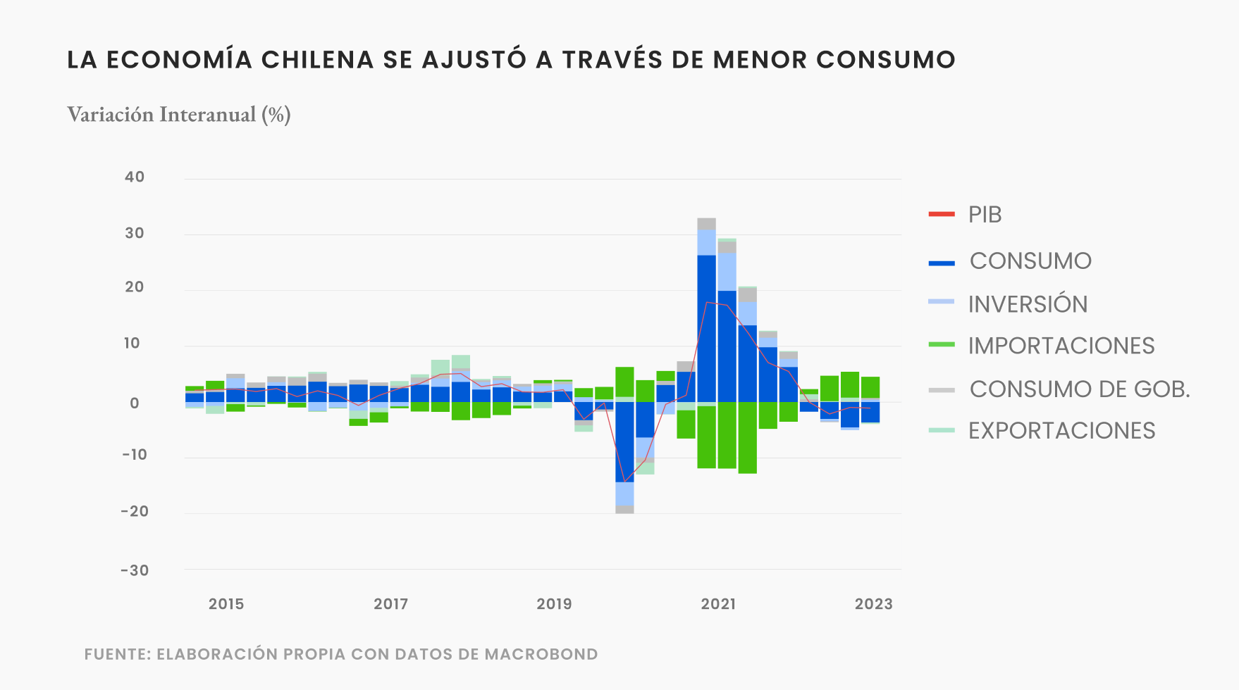 La economía chilena continúa contrayéndose en términos anuales. Tanto el consumo como las importaciones se han reducido, lo que refleja la corrección de los desbalances que se crearon con los estímulos otorgados durante la pandemia. El mercado laboral todavía muestra debilidad. La tasa de desempleo sigue relativamente alta, y los puestos de trabajo anunciados en internet son cerca de 30% menos que los tres años anteriores a la pandemia.