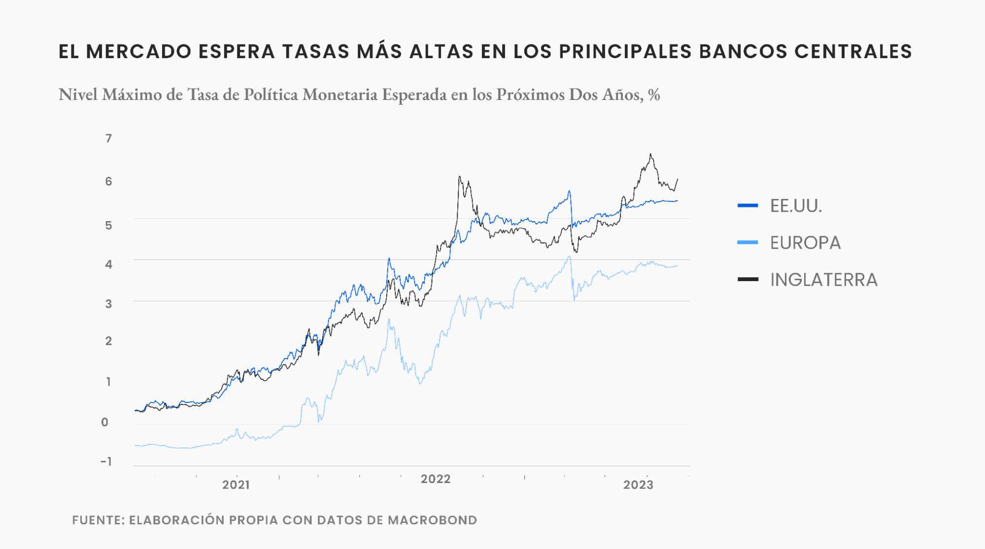 En este contexto, los bancos centrales de países desarrollados tuvieron que seguir subiendo sus tasas de política monetaria. Y de hecho, algunos de los que detuvieron los aumentos, como Canadá y Australia, tuvieron que reanudar el ciclo de alzas. Ahora se espera que los bancos centrales de los países desarrollados suban sus tasas de interés a un mayor nivel de lo que se esperaba a principios de año.