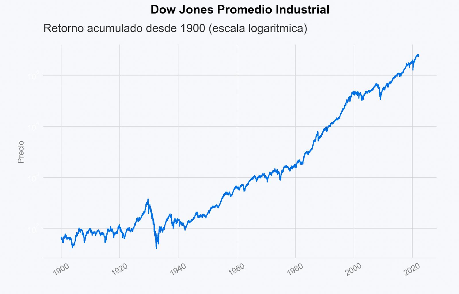 Por ejemplo, si vemos el retorno del Dow Jones desde 1900 a la fecha fue muy positivo, aunque hayan habido entremedio dos guerras mundiales.