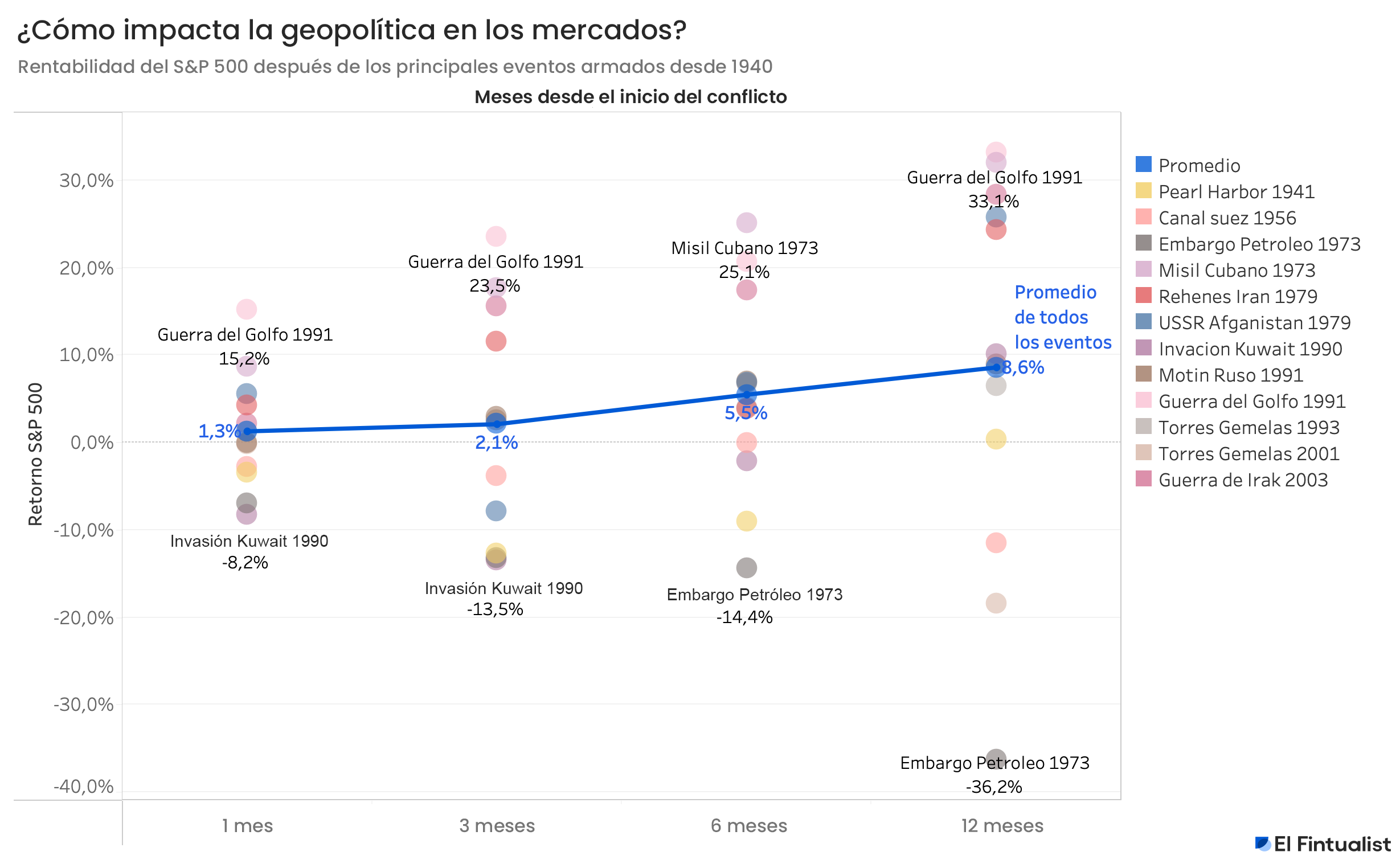 Si vemos el evento de peor y mejor rentabilidad para cada periodo (1, 3, 6 y 12 meses), hay un patrón que nos puede ayudar a entenderlo mejor. Los conflictos de peor rentabilidad son la invasión a Kuwait y el embargo petrolero de los estados árabes contra occidente. Estos eventos se caracterizan porque no fueron iniciados por países desarrollados como Estados Unidos y ambos supusieron una reducción en el acceso de los países desarrollados a elementos productivos como el petróleo, sobre todo en momentos donde la dependencia del petróleo árabe para la producción global era casi absoluta. Por otra parte, los eventos de mejor rentabilidad, la guerra del Golfo y la crisis de los misiles cubanos comparten que Estados Unidos fue protagonista en el conflicto y, en el caso de la Guerra del Golfo, fue útil para asegurar el suministro petrolero del Medio Oriente.