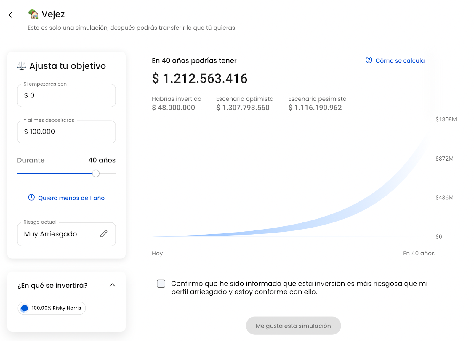 Así se ve una simulación invirtiendo 100 mil pesos al mes durante 40 años en el portafolio Risky Norris. El tiempo es clave para que tus inversiones crezcan exponencialmente.