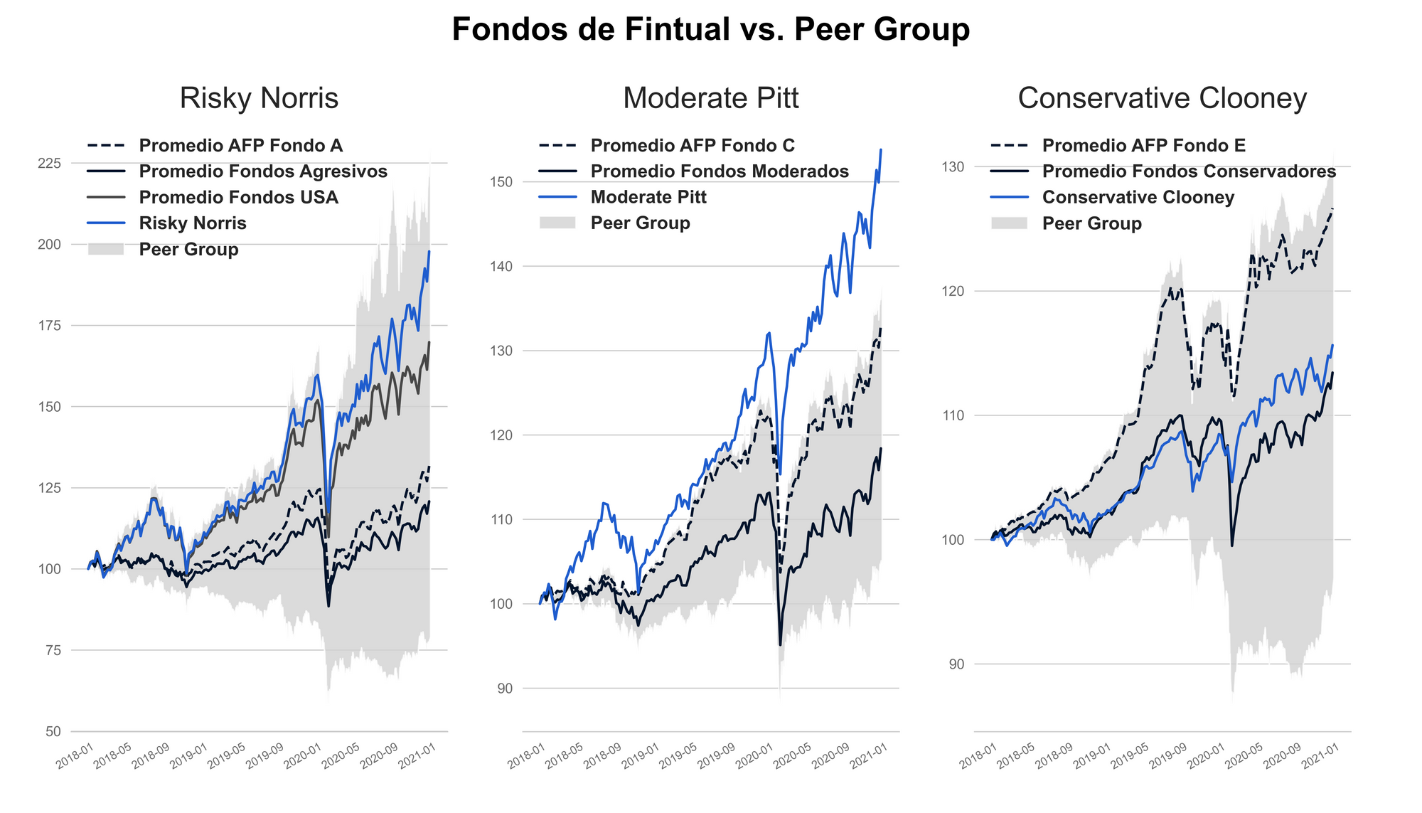 - Se consideró al fondo A como comparativo de Risky Norris por representar el portafolio más arriesgado de las AFP, pese a no necesariamente estar 100% invertido en activos de renta variable. Se consideró al fondo C como comparativo de Moderate Pitt dado que es el multifondo con el riesgo de nivel medio o moderado que ofrece el sistema de AFP, además es un multifondo que ha tenido un porcentaje de renta variable similar a Moderate Pitt. Se consideró al fondo E como comparativo de Conservative Clooney por ser el multifondo con la cartera menos riesgosa, y porque al igual que Conservative Clooney, no tiene un porcentaje mínimo de renta variable en sus límites de inversión, pese a que la duración de la cartera de renta fija del multifondo E es mucho mayor (renta fija de mayor riesgo).