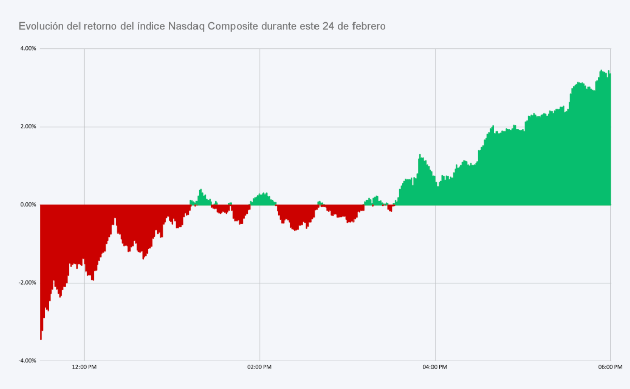 Y en ese sentido, si bien los mercados accionarios empezaron muy negativos, en Estados Unidos cerraron con importantes alzas que luego continuaron también durante el 25 de febrero. El Nasdaq, índice que agrupa a las principales acciones tecnológicas de EE.UU. y el S&P 500, que agrupa a las 500 más grandes de cualquier rubro, cerraron 8,79% y 6,56% más alto que sus niveles más bajos del día anterior. El siguiente gráfico muestra los movimientos que tuvo el Nasdaq durante el mismo 24. Una verdadera montaña rusa.