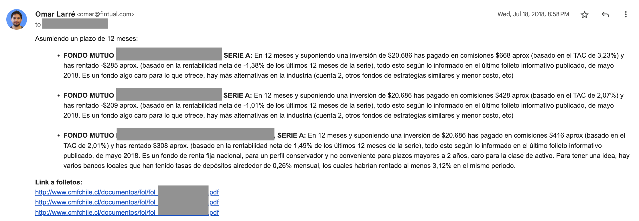 Si quieres analizar tus cartolas, basta con enviarlas todas al correo csi@fintual.com (o alternativamente subirlas a fintu.al/cartolas) y en un par de minutos recibirás un mail con el informe con el análisis detallado. Puedes enviar hasta 10 cartolas de manera gratuita.