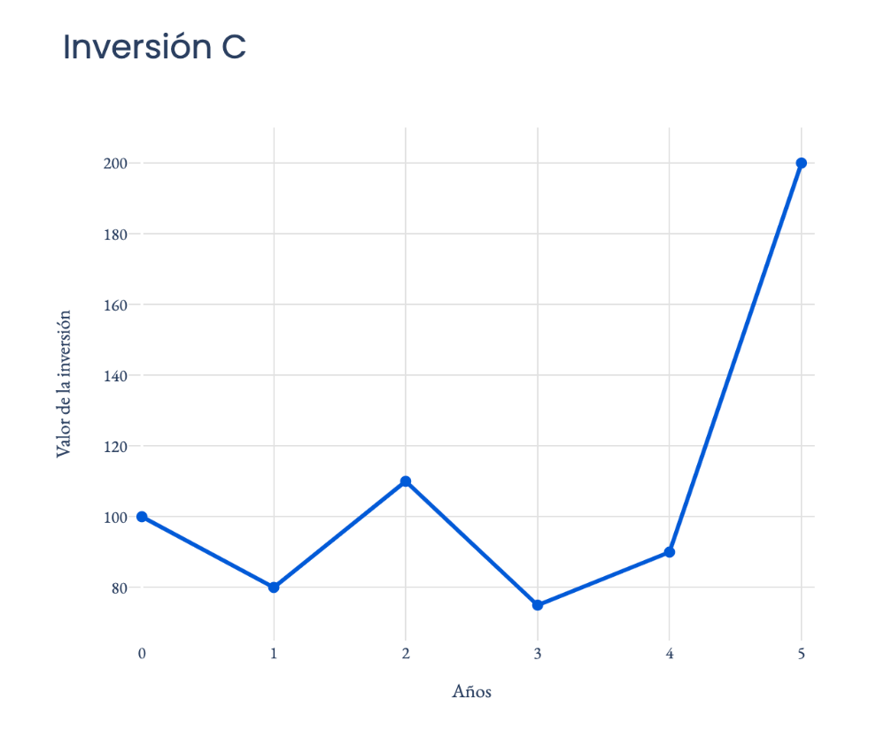 Mira estos tres gráficos. Podrían representar cualquier instrumento financiero: una inversión en depósitos a plazo, un fondo mutuo de renta fija o renta variable, ETFs o acciones. Lo importante es el patrón de cada uno, ya que son inversiones ficticias.