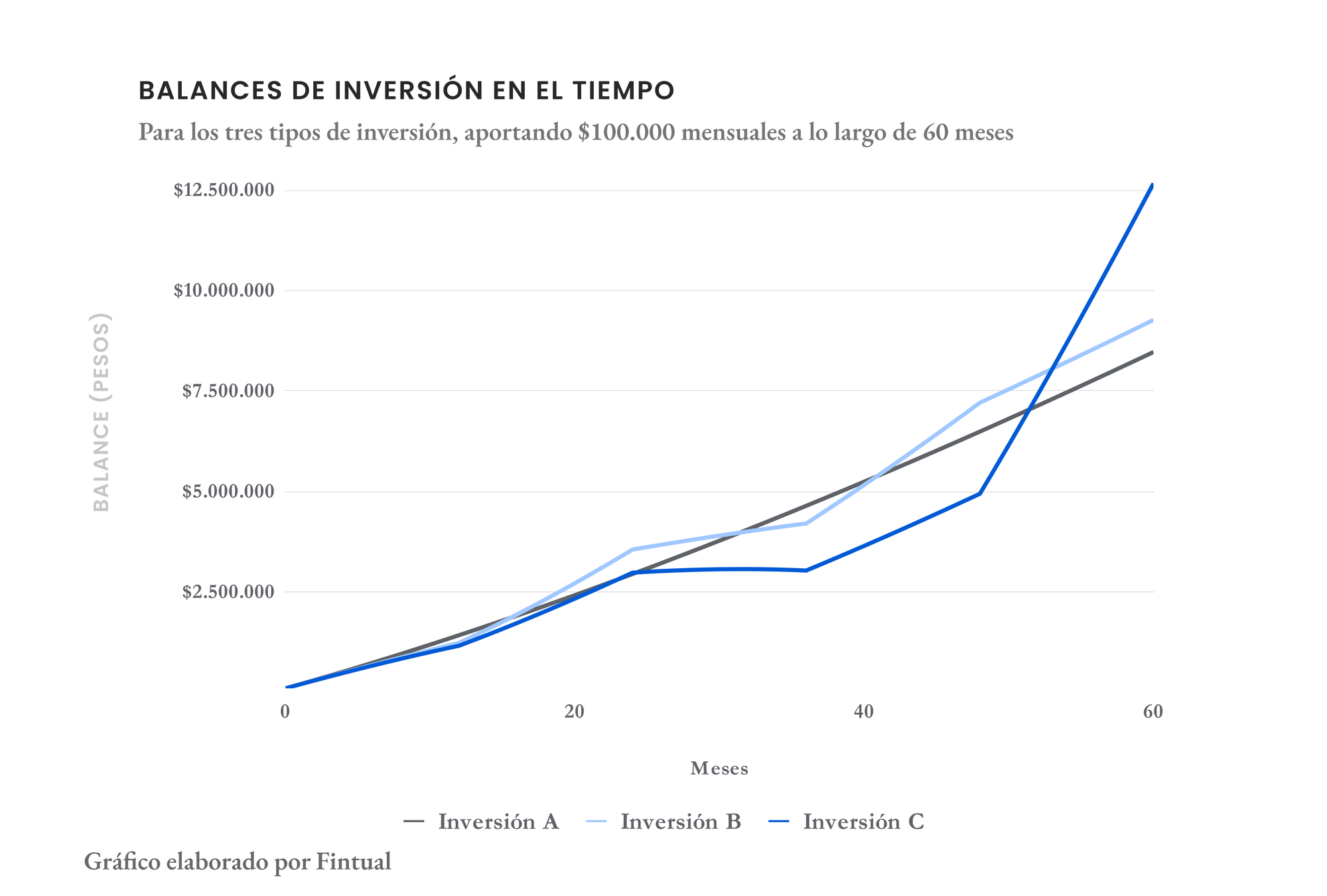 Tienes $100.000 mensuales para invertir, y tres opciones diferentes: cada una llegará al mismo destino en 5 años (más adelante veremos que este es el supuesto más falso), duplicando tu inversión inicial, pero el camino será muy distinto.