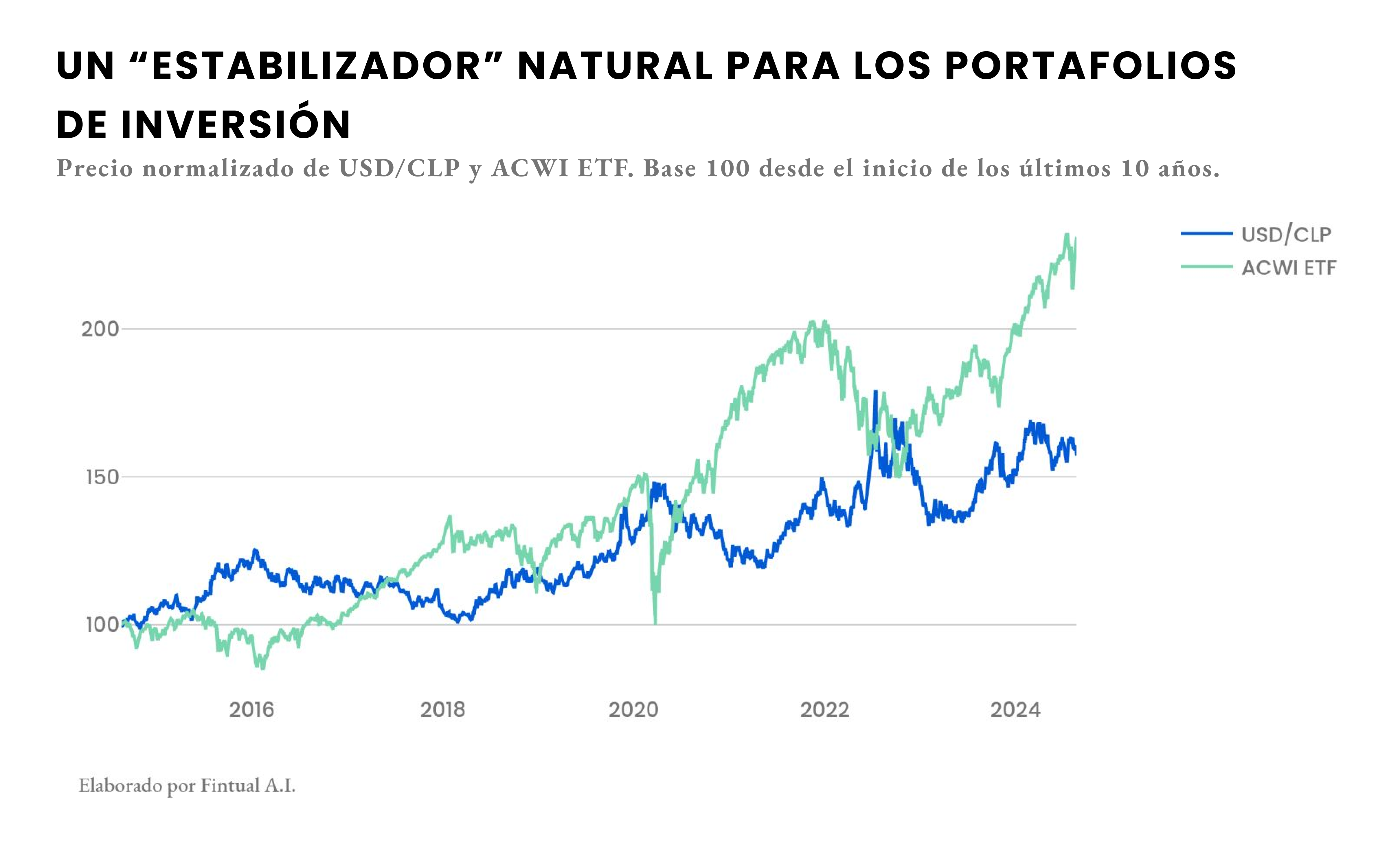 Tomemos como ejemplo un ETF de acciones globales como el ACWI. En los últimos 10 años, su correlación histórica con el USD/CLP ha sido aproximadamente -0,37. Esto implica que, en promedio, una caída del 1% en el ACWI viene acompañada de un alza del 0,37% en el dólar frente al peso, amortiguando la pérdida para el inversionista local. Lo mismo ocurre en sentido inverso con las ganancias.