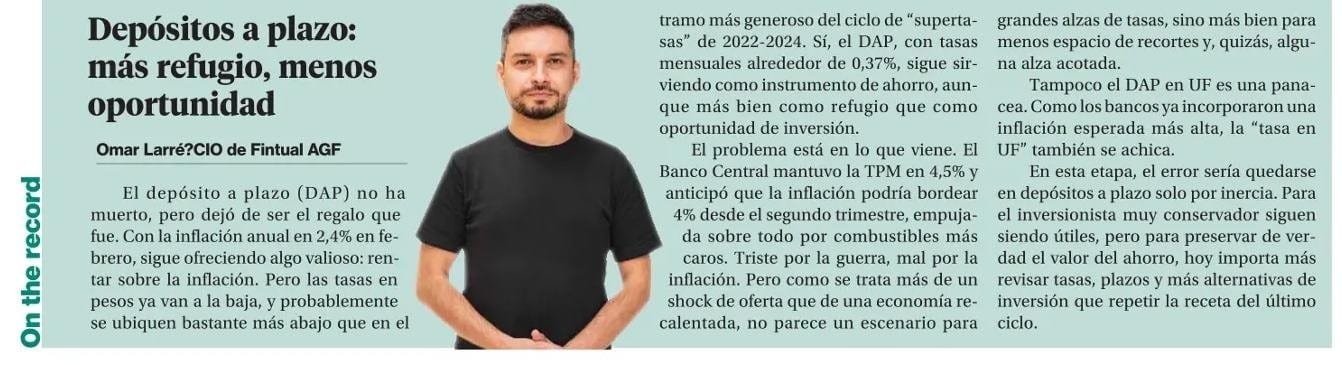 En esta etapa, el error sería quedarse en depósitos a plazo solo por inercia. Para el inversionista muy conservador siguen siendo útiles, pero para preservar de verdad el valor del ahorro, hoy importa más revisar tasas, plazos y más alternativas de inversión que repetir la receta del último ciclo.