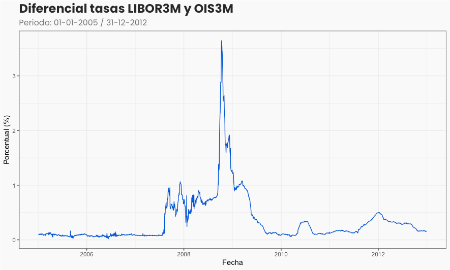 Hagamos doble click sobre el periodo 2005-2012, donde se observan 2 etapas: la primera desde el inicio de la serie (2005) hasta fines de 2007, y que muestra como LIBOR y OIS eran prácticamente indiferentes. Esta es la época en donde todo iba de maravillas y nadie ponía ojo en los riesgos relevantes por cada transacción. Pero luego en la segunda parte, desde 2008, vemos diferencias (spread) que son apreciables incluso a simple vista. A continuación podemos ver esto si graficamos el diferencial de tasas entre ambos recordando que lo esperado debiese rondar el 0: