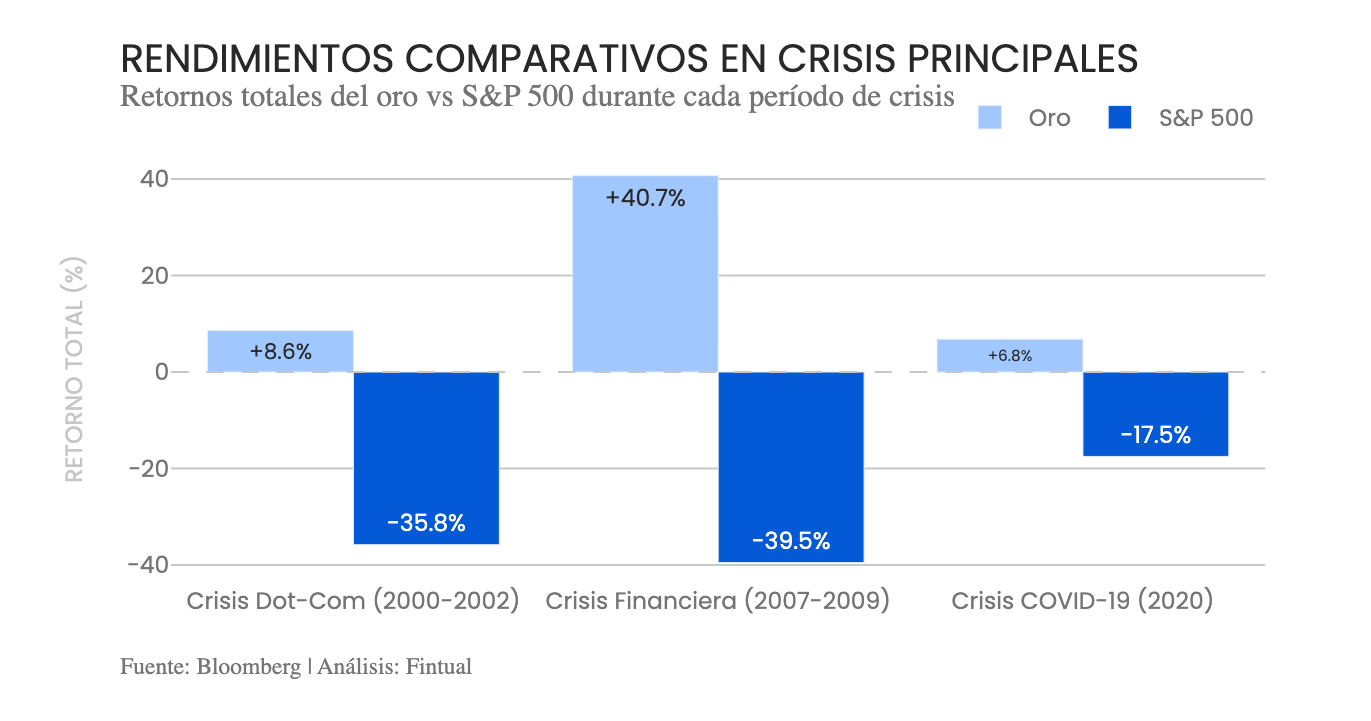 Durante shocks o crisis importantes en que los activos de mayor riesgo caen de forma pronunciada, el oro suele tener rendimientos positivos.