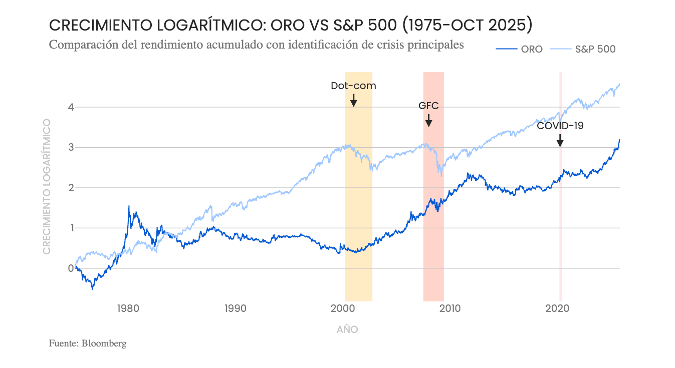 A modo de comparación, desde 1975 el oro ha rentado cerca de 6% anual en promedio, mientras que el S&P 500 ha rentado cerca de 12%.