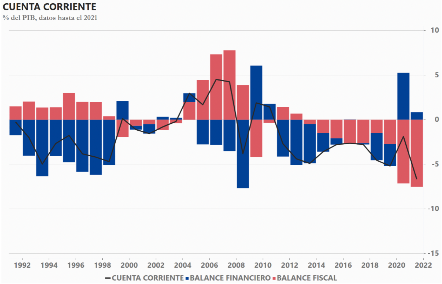 En Chile, la cuenta corriente ha estado en déficit desde hace más de una década. Inicialmente era el sector privado el que explicaba este déficit, pero en los últimos años ha sido el sector público. Los datos más recientes indican que tanto el sector público, como los hogares y las empresas consumieron más de lo que producían, y por tanto Chile tuvo que importar mucho.