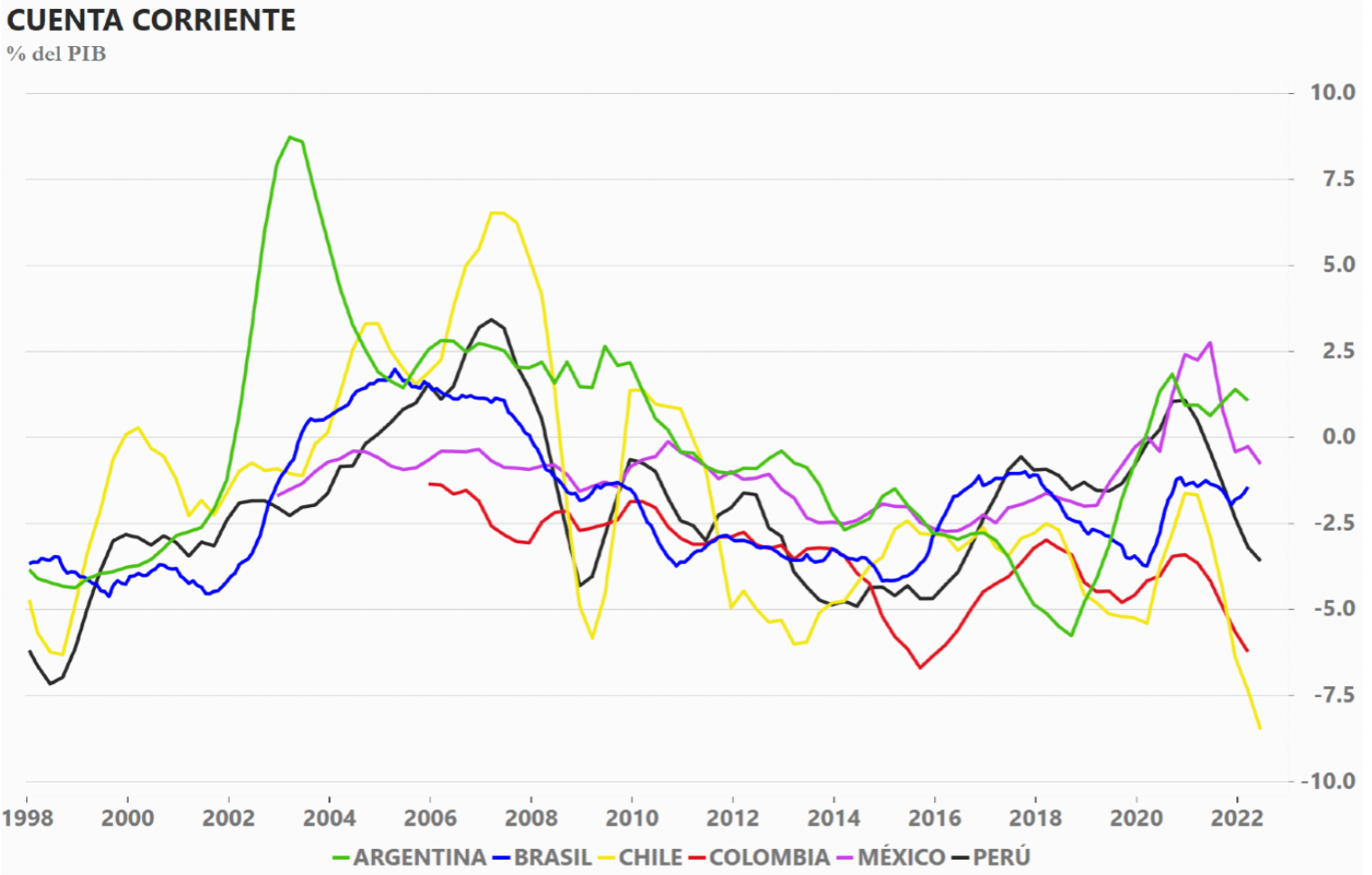 De hecho, en el pasado Latinoamérica se ha hecho notar por crisis asociadas a sus cuentas corrientes: en 1982, 1994, y 1997. Sin embargo, más recientemente, la combinación de mejores características del financiamiento y mejor manejo macroeconómico en general han hecho estas crisis menos frecuentes.