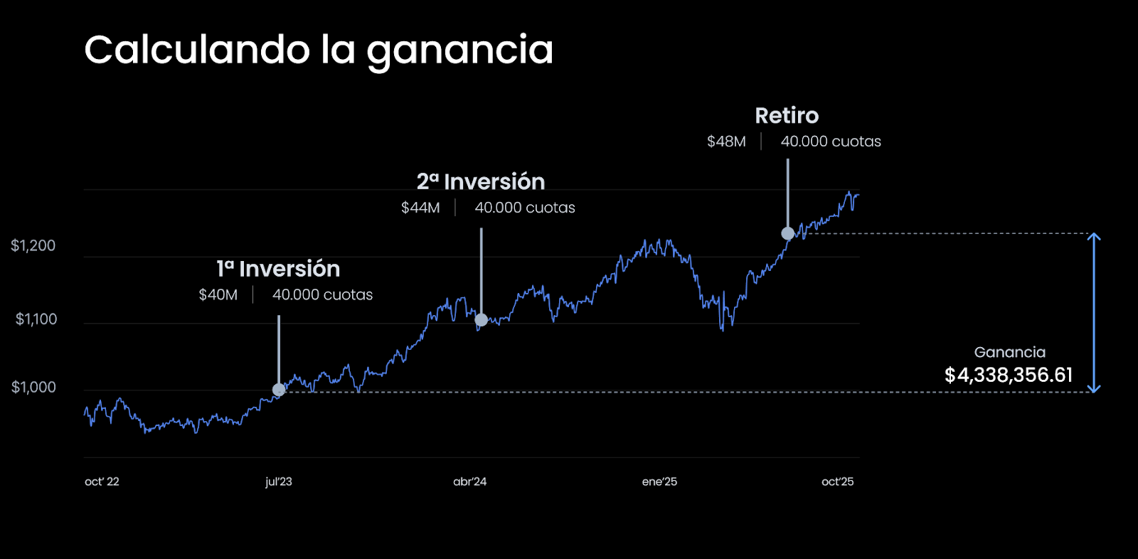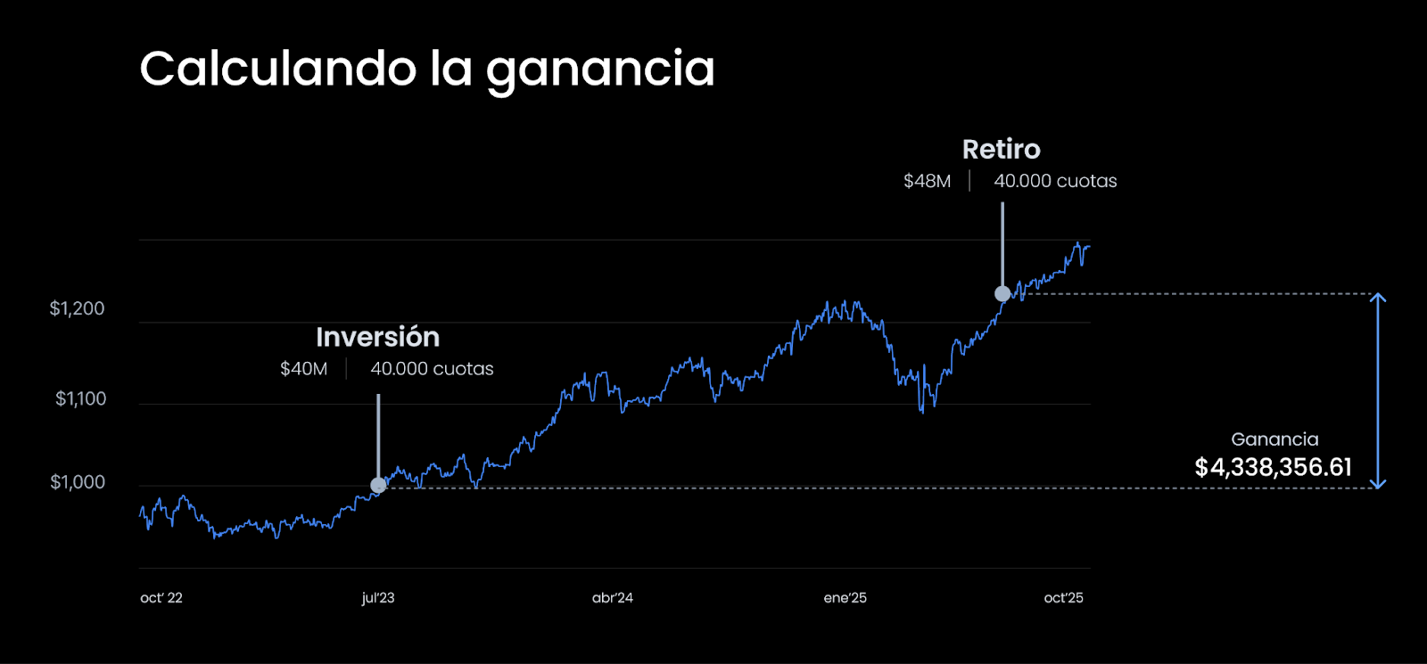 - Inviertes el 01 de julio de 2023 un monto de $40.000.000. El valor cuota en ese minuto era $1.000 y alcanzaste a comprar 40.000 cuotas.