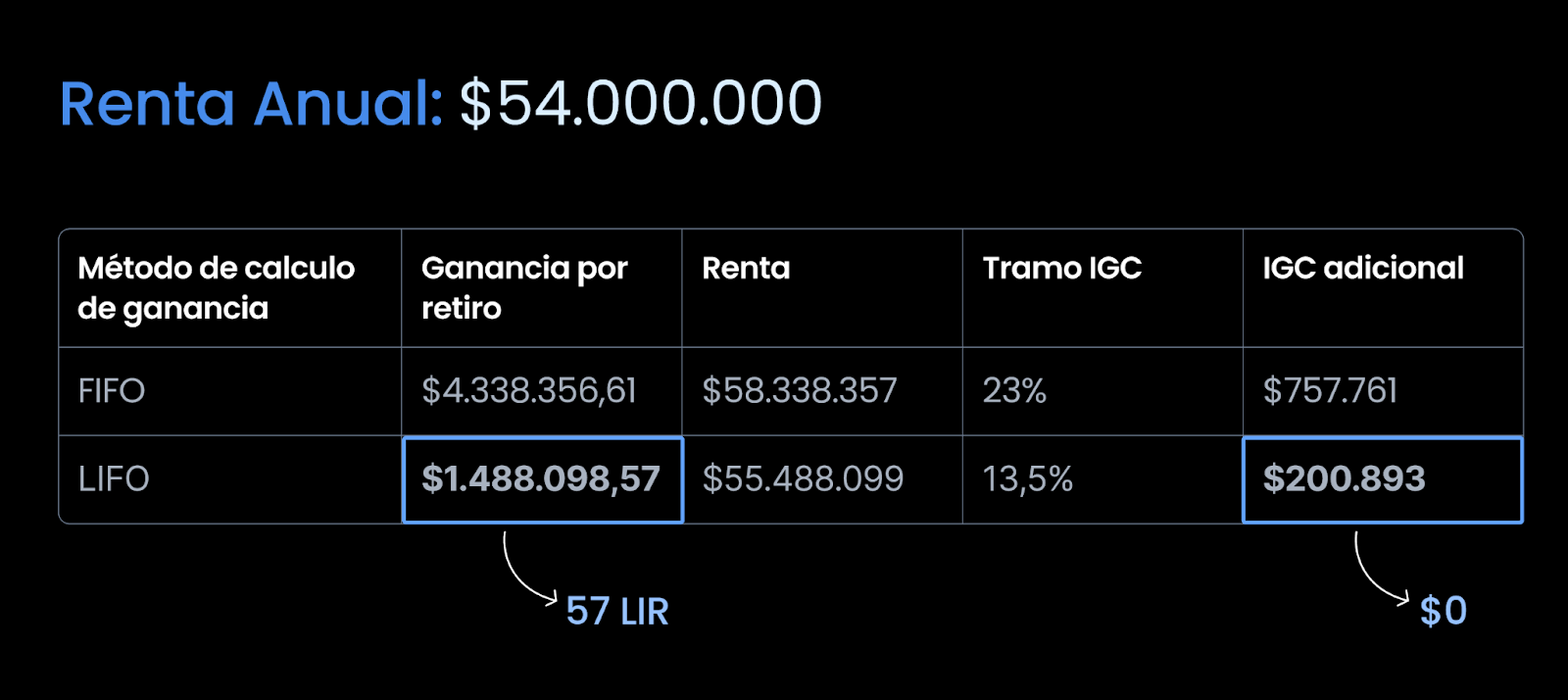 No solo pagas considerablemente menos impuesto aplicando LIFO, sino que en este caso particular, el monto de la ganancia queda dentro del rango del beneficio del artículo 57 de la Ley del Impuesto a la Renta. Este beneficio consiste en que los retiros de fondos mutuos en un año que tienen ganancias menores a 30 UTM (poco más de de 2 millones de pesos) están libres de impuesto a la renta, siempre y cuando la persona cumpla con las condiciones de no recibir otras rentas como honorarios, o dividendos de acciones nacionales, por ejemplo o en general, otros ingresos distintos a rentas del trabajo dependiente. Puedes leer más sobre 57 LIR aquí.