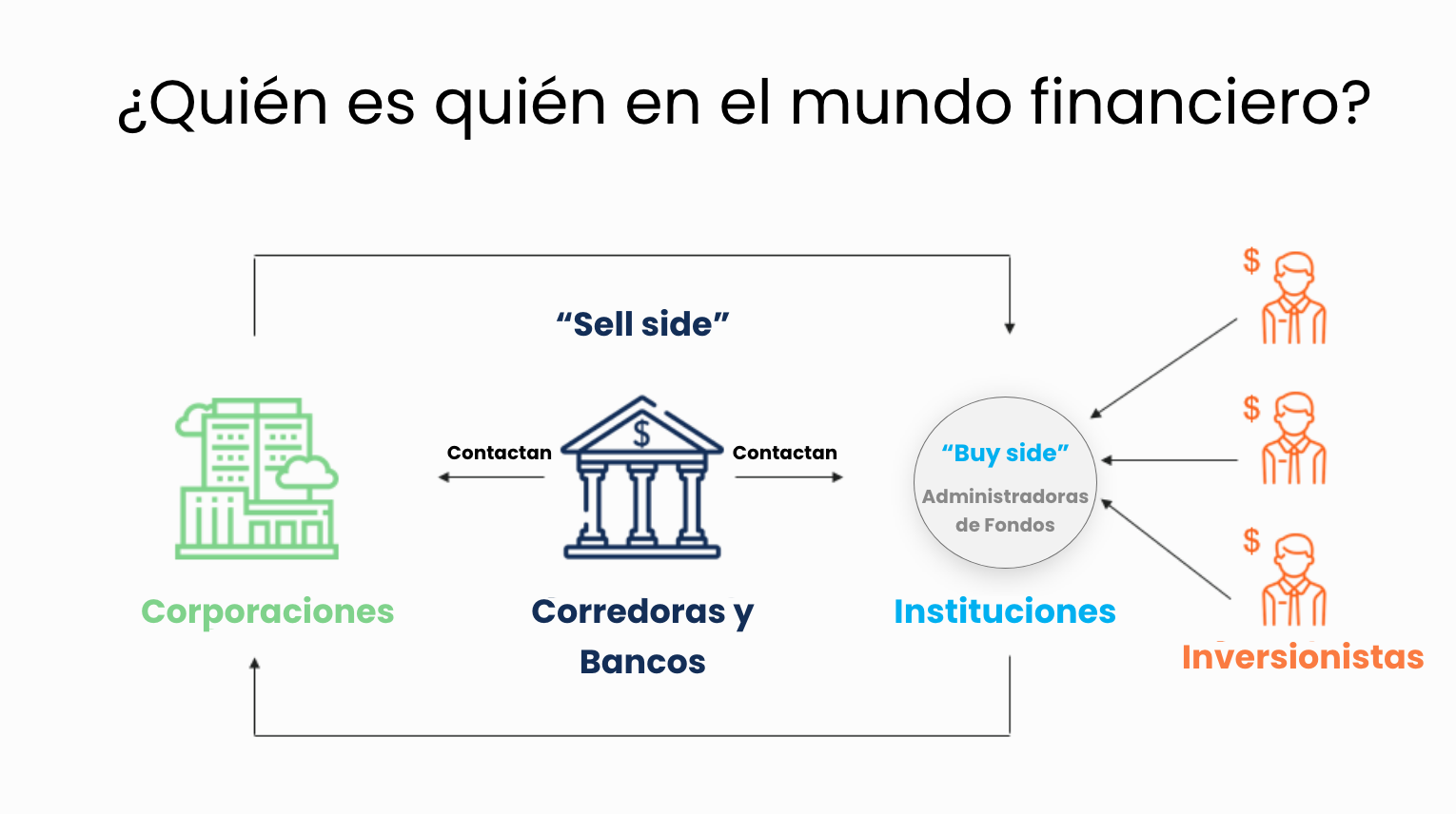 Por un lado, el sell-side ayuda a las compañías y gobiernos a obtener financiamiento a través del mercado. Es decir, lo que hacen es servir de puente entre el buy-side y estas organizaciones que necesitan plata.