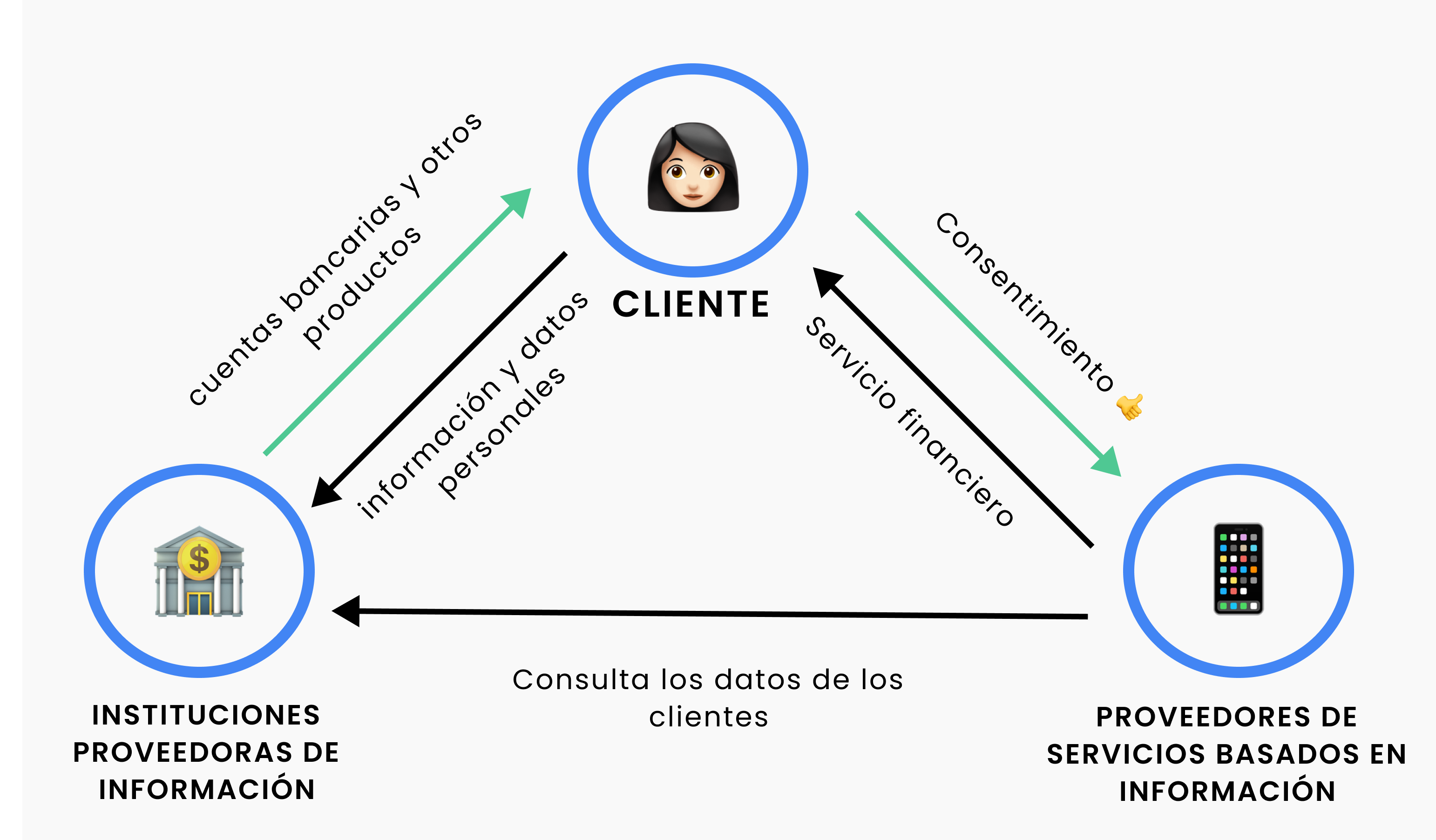 Por otro lado están las instituciones que necesitan tu información para ofrecer los servicios que mencionábamos antes (técnicamente, Proveedores de Servicios Basados en Información). En general se piensa en estas empresas como fintechs que con alto uso de tecnología logran ofrecer nuevos servicios y productos. Y no es una idea lejana a la realidad, por algo el sistema de finanzas abiertas se introduce en la Ley Fintech, pero lo cierto es que cualquier participante del sistema podría consultar información, incluidos los que también la proveen.