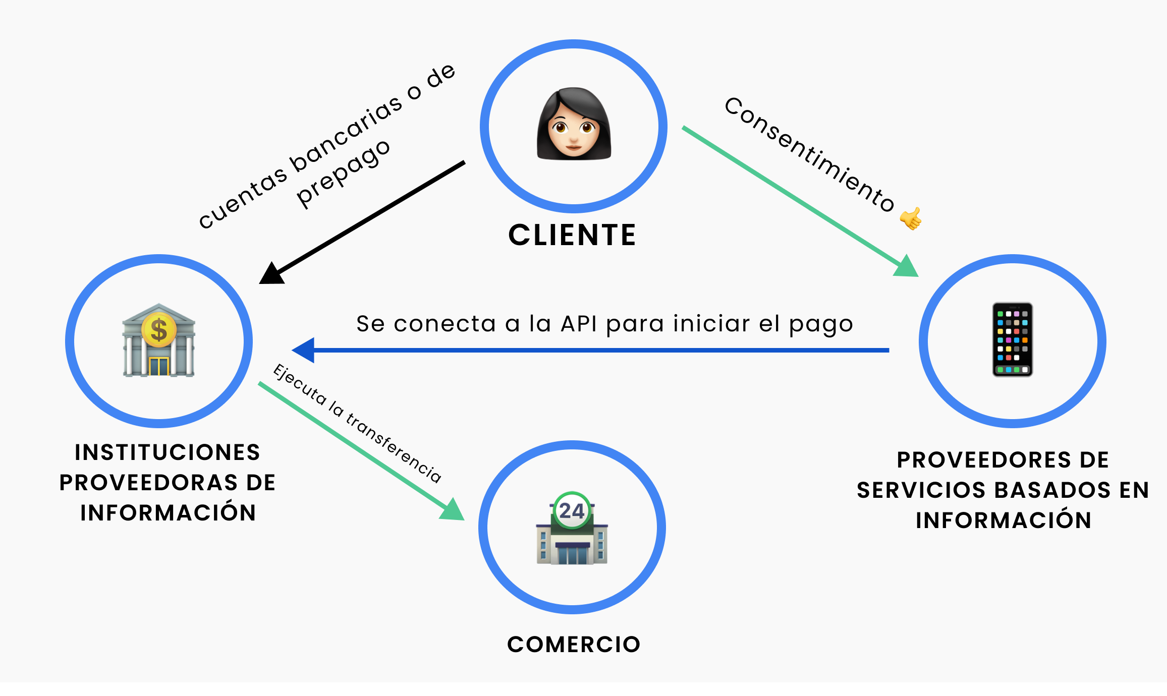 - El Iniciador de Pagos, con el consentimiento del usuario, hace una solicitud a la API de la institución desde donde el cliente tiene la plata para hacer el pago (oficialmente, Instituciones Proveedoras de Cuentas).
