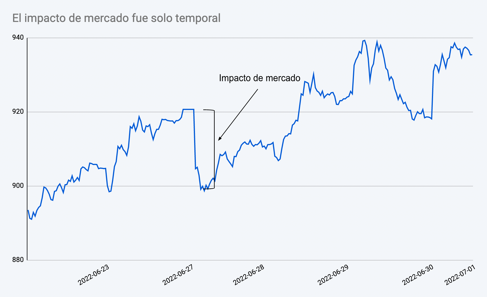 Pero el efecto alivio duró poco. Las operaciones de mercado, como la venta de dólares por parte de Hacienda, tienen un impacto en el mercado. Este impacto se mide por la diferencia entre el precio del dólar antes de que se iniciara la venta, y el precio al que al que efectivamente se vendió. A su vez, este impacto se divide en temporal y permanente. La mayor parte de este impacto es solo temporal, y refleja la concesión de precio necesaria para atraer contrapartes al momento de la venta. El impacto permanente suele ser relativamente chico.