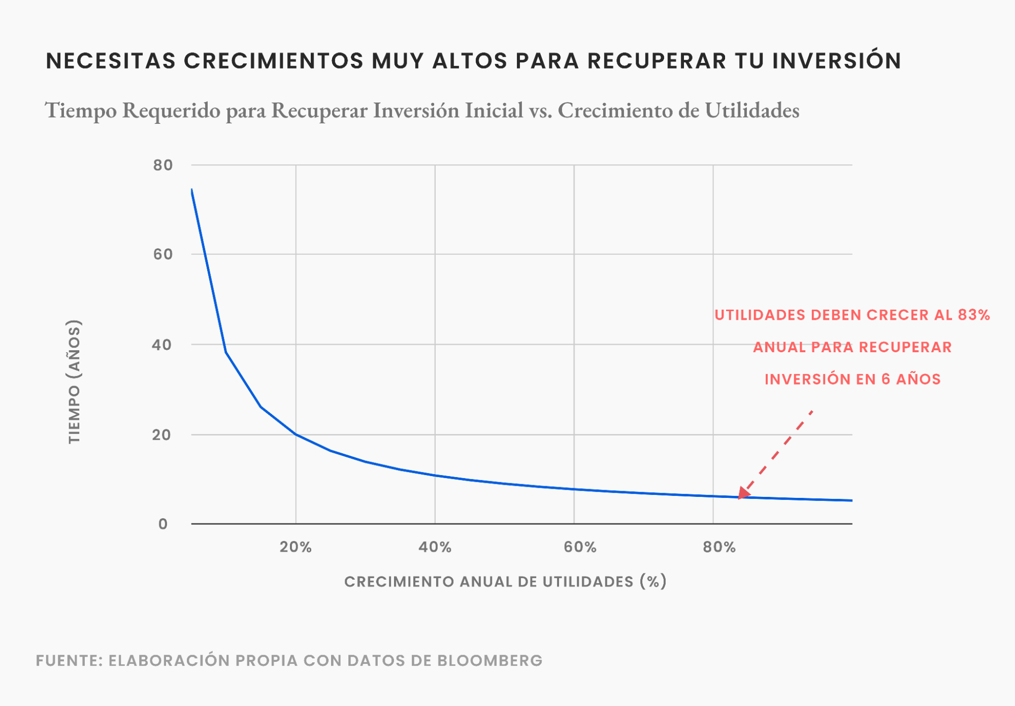 En segundo lugar, lo razonable es suponer que las utilidades crecen durante el tiempo, y en particular en esta industria, donde se espera que los ingresos crezcan de manera sustancial en los próximos años. El consenso de mercado espera que las utilidades del sector de semiconductores crezcan durante los próximos 5 años a una tasa de en torno a 25% anual, con lo que el tiempo requerido para recuperar la inversión baja de 38 a 16 años. Sin embargo, este es un número aún muy por sobre lo que en promedio ha tomado recuperar lo invertido en empresas tecnológicas (6 años, considerando la rentabilidad histórica del Nasdaq). De hecho, si despejamos a qué tasa tendrían que crecer las utilidades para recuperar la inversión en 6 años, este cálculo entrega la exorbitante cifra de 83% anual por los próximos 6 años !!