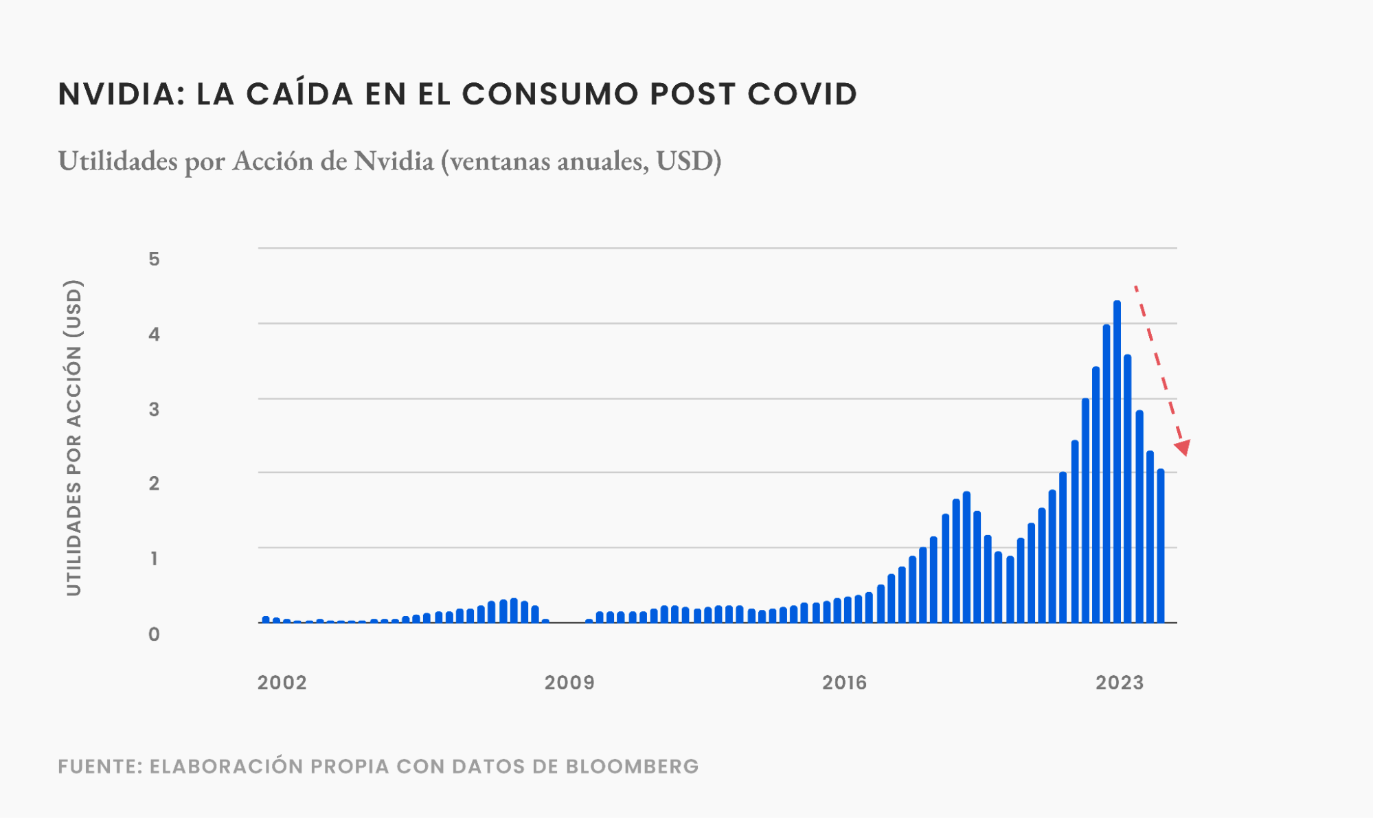 En primer lugar, las utilidades del último año han sido particularmente bajas producto de un aumento en los inventarios en conjunto con la disminución que tuvo el consumo global. Esta caída se ve más clara en el siguiente gráfico de las utilidades de Nvidia.