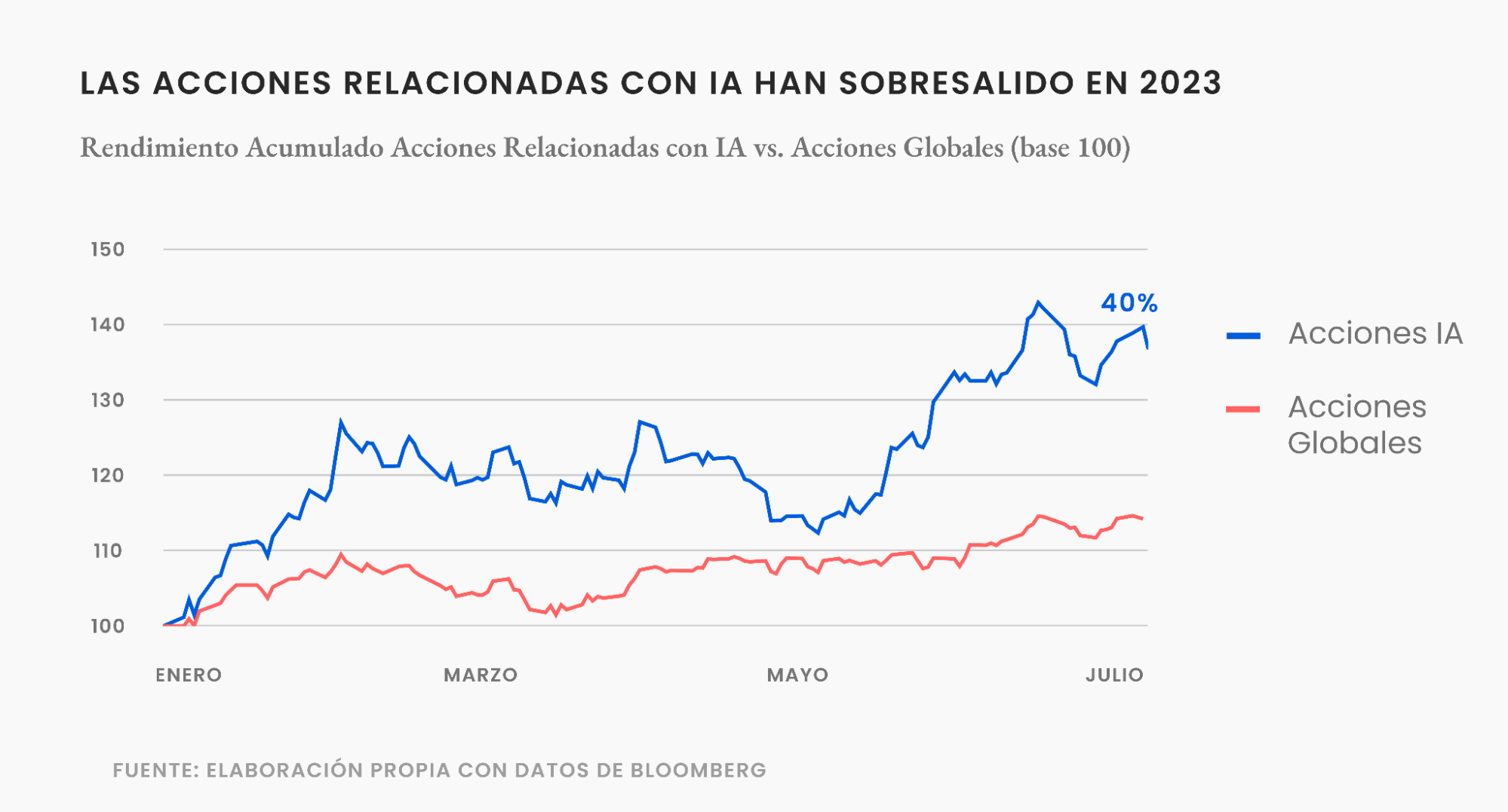 En lo que va de 2023, las acciones de compañías relacionadas con inteligencia artificial (IA) han rentado cerca de un 40%, muy por sobre el mercado en general.