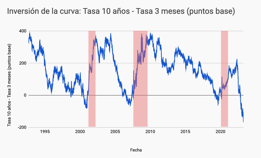 Hay muchas formas de medir la inversión de la curva, pero una de las métricas más utilizada, y la favorita de la Fed, se construye restando la tasa de 10 años con la de tasa de 3 meses (pendiente de 10 años con 3 meses). Si la pendiente es negativa, eso es un indicador de que viene una recesión. En el siguiente gráfico se muestra la evolución histórica de esta pendiente para la curva de Estados Unidos, las recesiones están pintadas con el área roja.