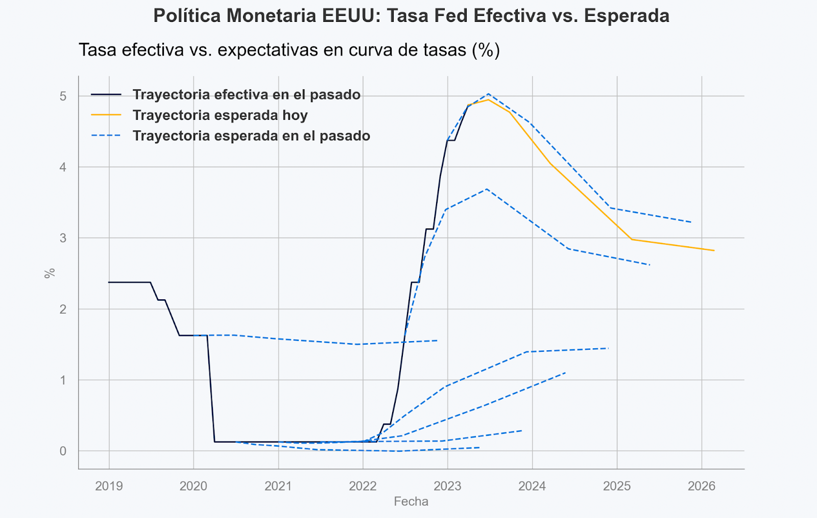 Como se observa en el gráfico, si bien el mercado ha acertado con algunos movimientos de la tasa de interés de la Fed, en otras ocasiones ha fallado por mucho. Por ejemplo, a inicios de 2022 se esperaba que la tasa subiera lentamente pero lo que en realidad ocurrió fue que la Fed subió su tasa de manera agresiva.