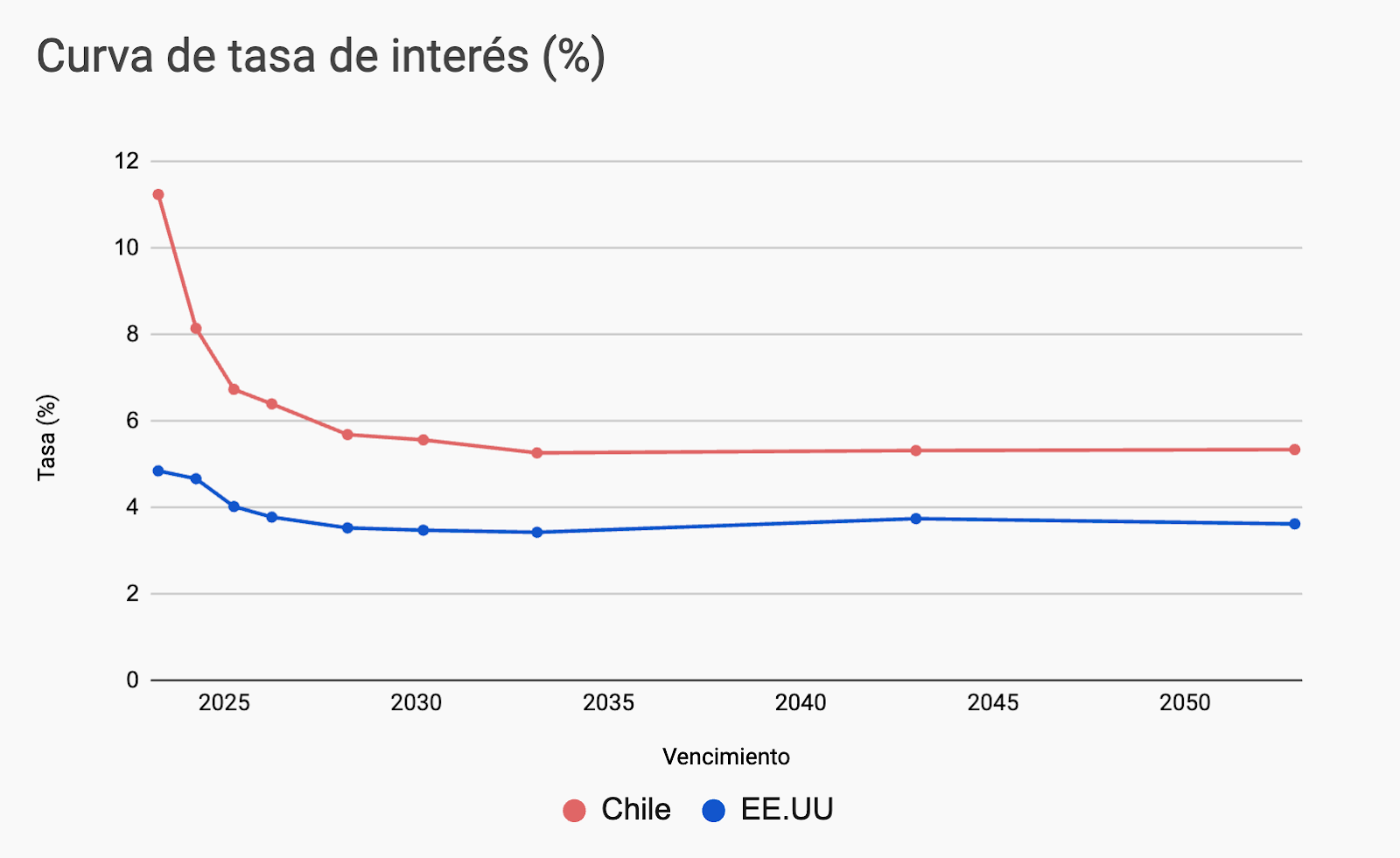 Por ejemplo, la curva de tasas de interés de Chile (de bonos soberanos emitidos en pesos chilenos) y la curva de Estados Unidos (de bonos soberanos emitidos en dólares) hoy se ve así:
