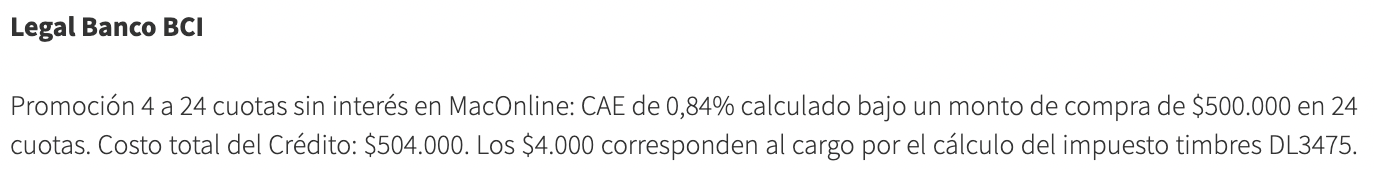 La promoción de 24 cuotas sin interés es con las tarjetas de Santander, Banco de Chile, BCI, Scotiabank e Itaú. Si vamos a las condiciones de la promoción, vemos que cada banco tiene una CAE distinta: