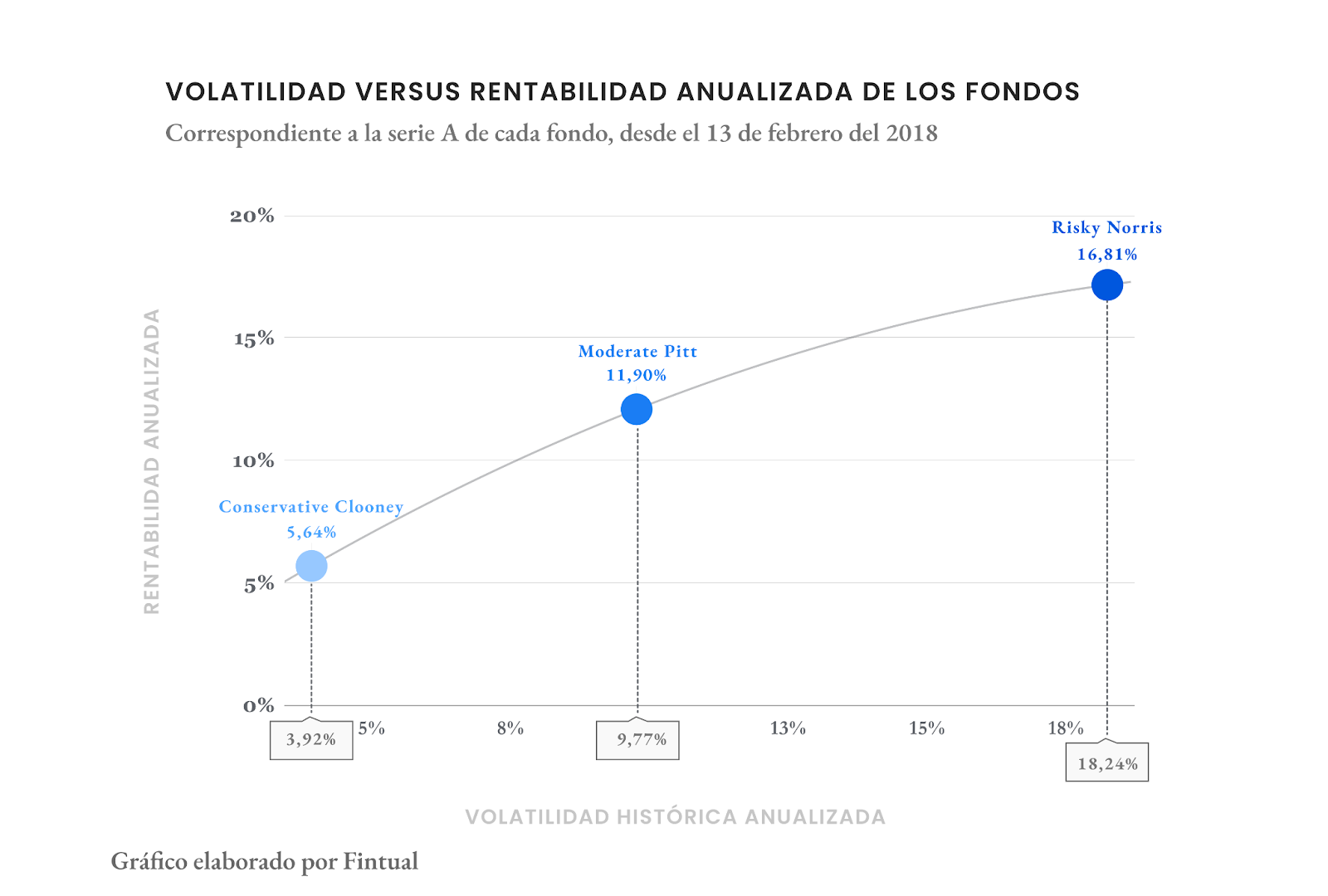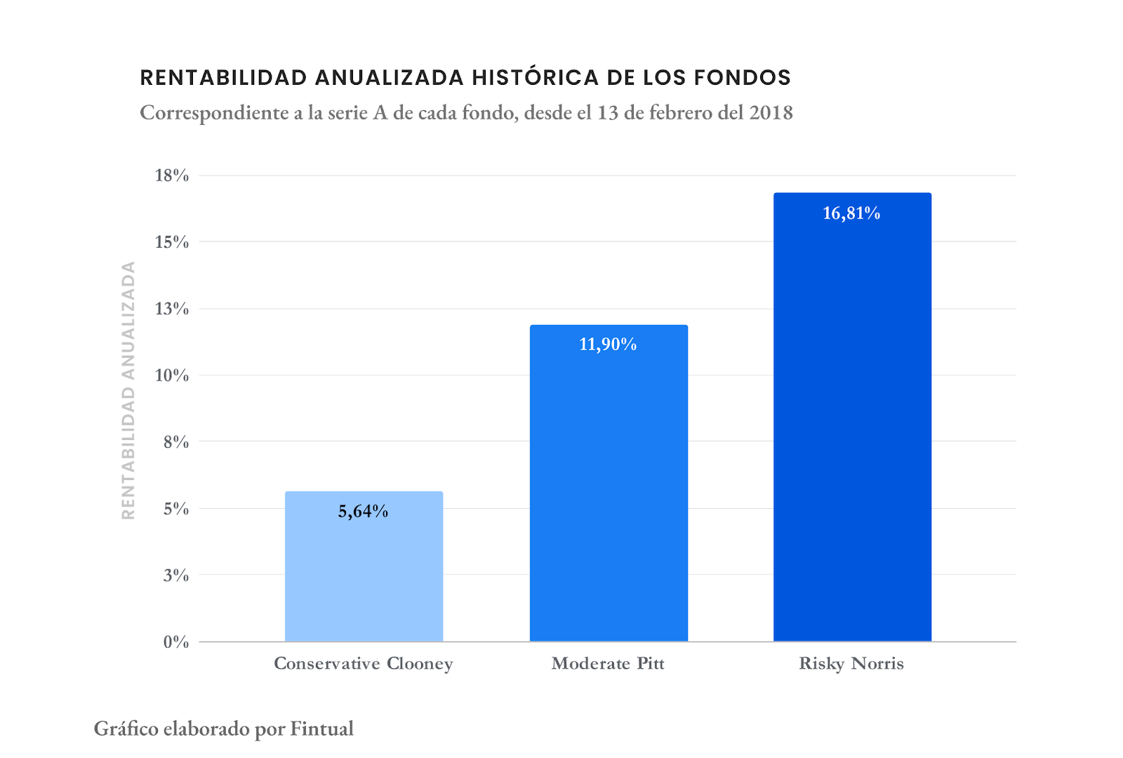La rentabilidad promedio anual es la siguiente para cada fondo: el fondo Conservative Clooney ha obtenido una rentabilidad promedio anual de 5,64%, el fondo Moderate Pitt ha logrado un 11,90%, y el fondo Risky Norris ha alcanzado un destacado 16,81%. Todos los valores corresponden al desempeño anualizado de la serie A de cada fondo, neta de comisiones y remuneraciones.