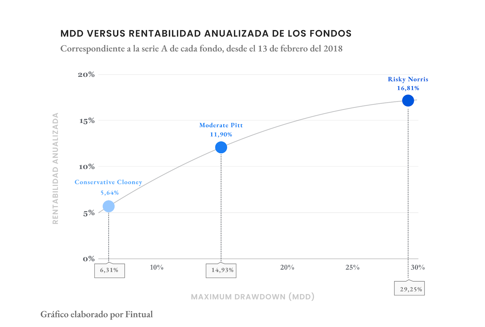 Vamos a ver los números históricos de estos 6 años. El fondo Conservative Clooney tiene un MDD del 6,31%, lo que sugiere que es relativamente estable, con una menor caída máxima histórica. Moderate Pitt muestra un MDD del 14,93%, es decir, con caídas más pronunciadas en su valor pero aún muy manejable para inversionistas de largo plazo. Por último, Risky Norris registra un MDD del 29,25%, mostrando que este fondo ha tenido una gran caída histórica en su valor, representando el nivel más alto de riesgo de los tres, reafirmando que este fondo es para inversionistas de largo plazo y con perfil arriesgado.