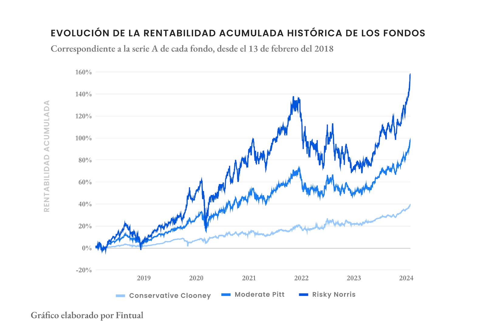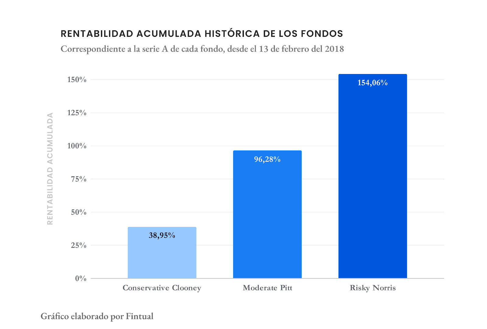 El resultado del acumulado histórico de estos 6 años es bastante bueno: el fondo Conservative Clooney ha logrado un retorno del 38,95%, mientras que Moderate Pitt ha alcanzado un notable 96,28%. Por su parte, Risky Norris, el fondo más arriesgado, ha logrado un rendimiento del 154,06%.
