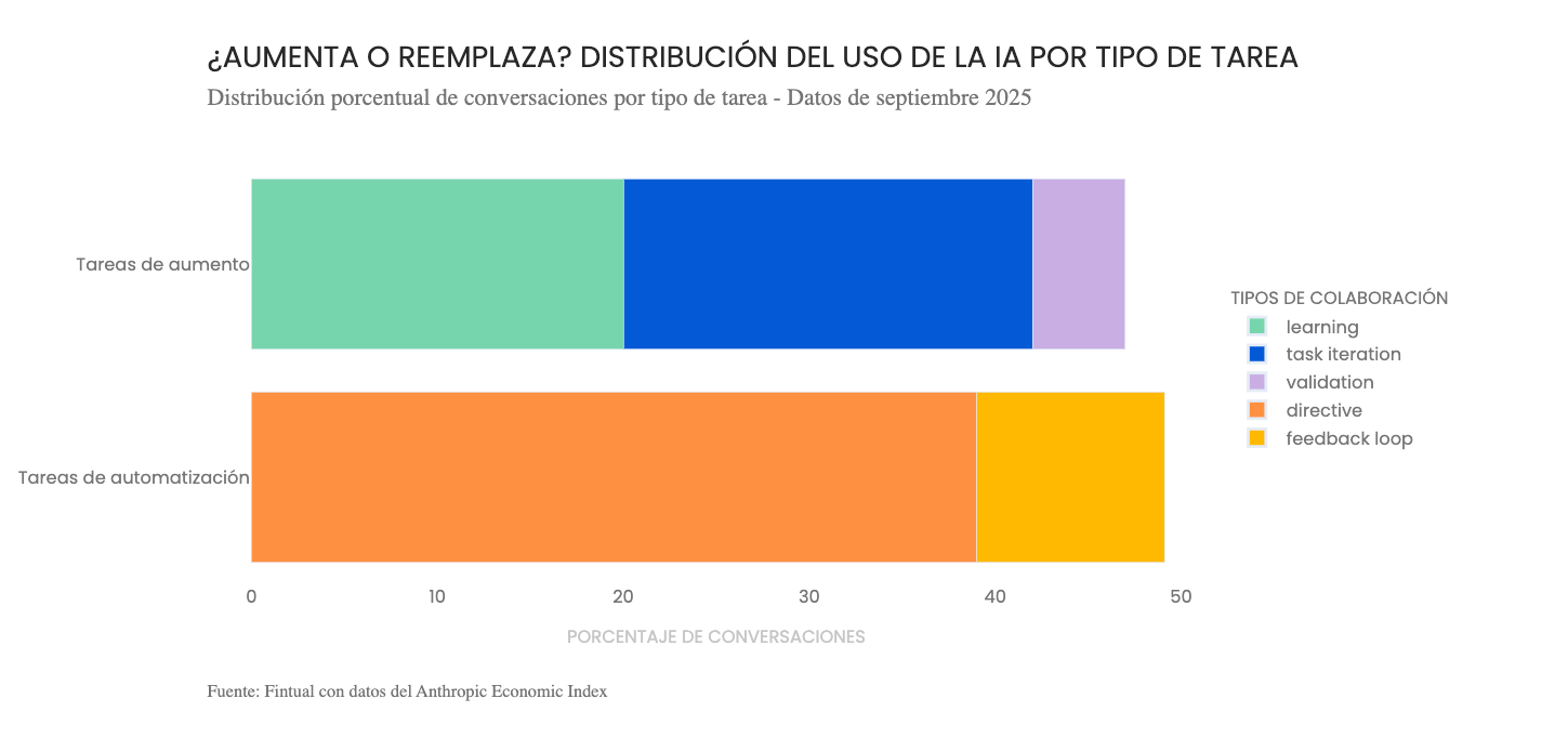 3) usa múltiples medidas de exposición a IA, incluyendo el Anthropic Economic Index, que analiza millones de conversaciones reales con Claude para clasificar qué tareas u ocupaciones están siendo abordadas con IA, y si el uso pertenece a alguno de los dos grupos que el artículo utiliza para clasificar tareas: “automatización” (la IA ejecuta tareas completas, sustituyendo el trabajo humano), o de “aumento” (la IA colabora con humanos para complementar sus capacidades). Dentro de esos dos grupos, las tareas se descomponen en otras subcategorías.